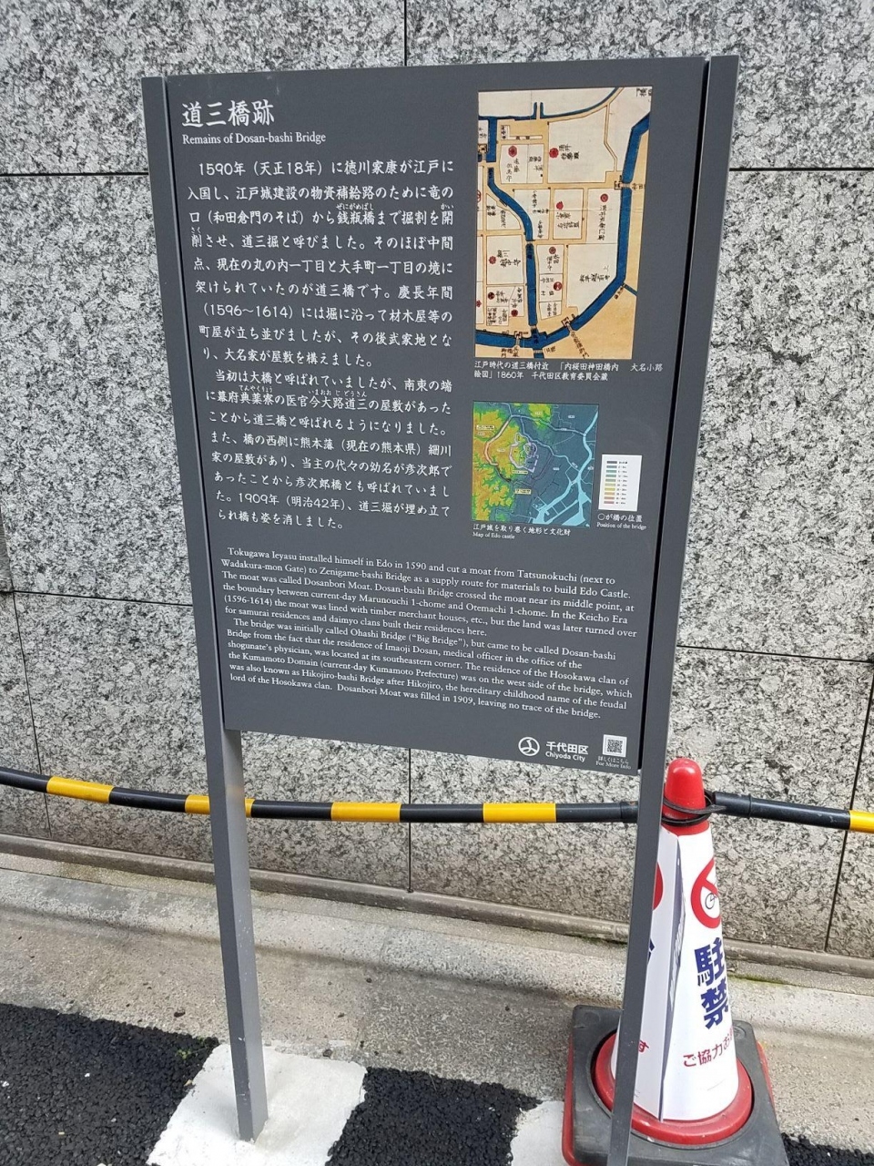 永代通りから大手町野村ビルと新大手町ビルの間の道を進むとありました。徳川家康の命により江戸城へ物資を運ぶために和田倉門から呉服橋辺りまで道三堀というお堀がつくられましたが、その途中に架かっていた橋です。橋の近くに医師の今大路道三の屋敷があったから付いた名前だとか。呉服橋にしろ道三橋にしろ、江戸時代にお堀があったことを想像しながら歩いてみるのも良いですね。