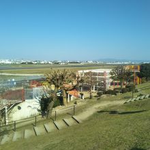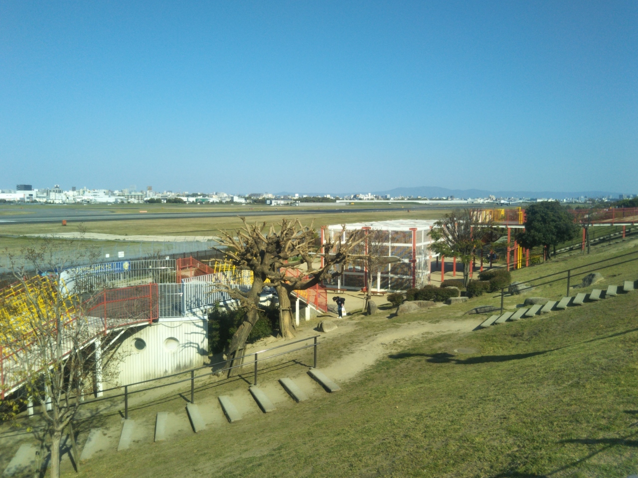 大阪伊丹空港の西側、尼崎市側沿いに1kmほど続く、長い公園です。駐車場が何か所か整備されています。滑走路が目前にある為、航空機の離発着をすぐ目の前で見ることができます。広場や遊具類もあり、家族連れのお客さんで結構賑わっています。