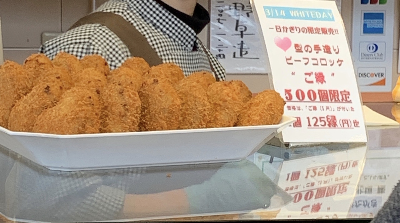 ホワイトデーに伺いました。いつもは販売していないハート型のコロッケが数量限定で販売していて、思わず購入してしまいました。普通のコロッケの方が数円安くて若干大きめですが限定品なので、もしホワイトデーの日に利用することがあればお勧めです。