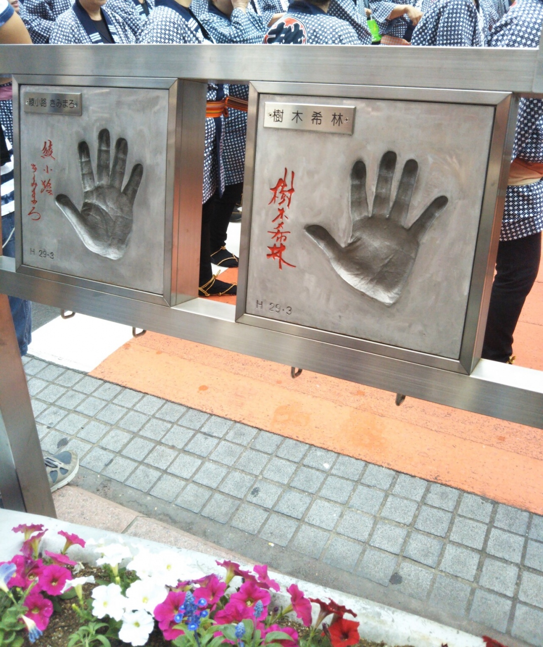 浅草のオレンジ通りにある「浅草公会堂」に「スターの広場」があります。日本で活躍されていらっしゃるスターの方々の手形がモニュメントとなっています。