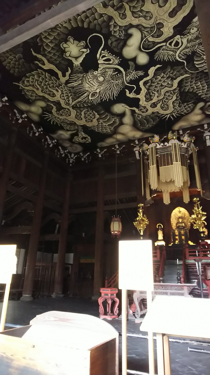 花見小路を通り抜け歌舞練場を過ぎると入り口が見える。京都最古の禅寺だそうで、風神雷神の屏風が国宝で有名。また、法堂には双龍図が描かれた天井があり今見る事ができる。比較的新しいものですが珍しいです。雲龍図の描かれた襖絵も迫力がありますが、こちらは複製