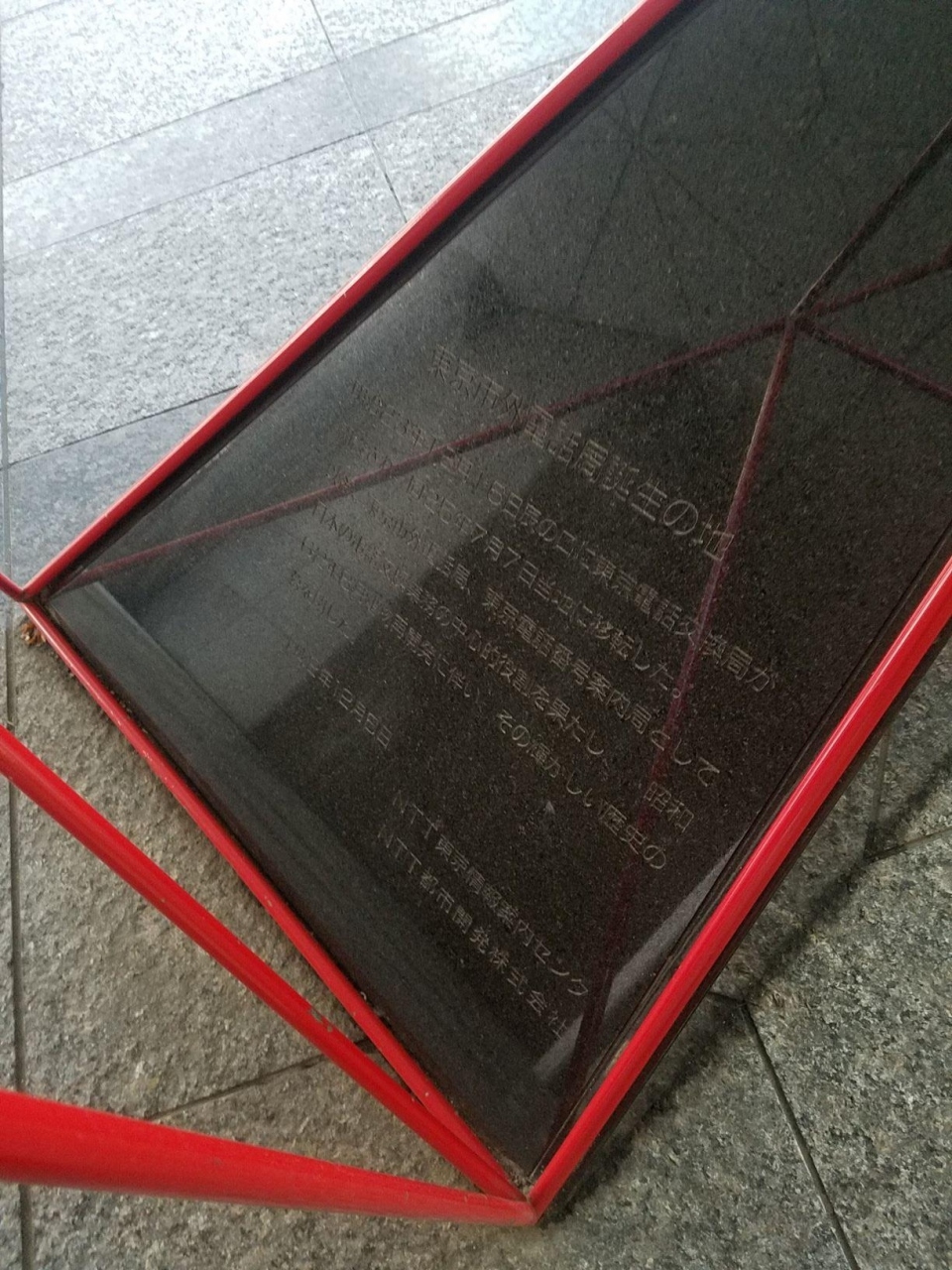 アーバンネット大手町ビルの軒下みたいな所にありました。赤い骨組みみたいなオブジェで最初は公園にある遊具か何かかと思いました。大名小路に面した三菱UFJ信託銀行 信託博物館の右手の壁に電話交換創始の地のプレートが埋め込まれていましたが、その電話交換局がここに移転して東京市外電話局となったそうです。オブジェの基部に説明がありましたが見づらいので気が付く人が少なそうで勿体なかったです。