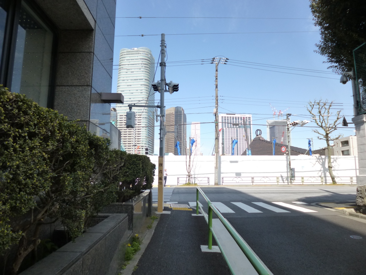 島崎藤村の旧居跡を見た後、植木坂、鼠坂を通って、狸穴坂の坂下に来ました。ロシア大使館の壁を右手に見ながら坂を上がって行くと、巨大な工事用のフェンスが。以前は、旧郵政公社のどしっとした建物が見えていただけに残念です。新しい風景を楽しみにしたいと思います。