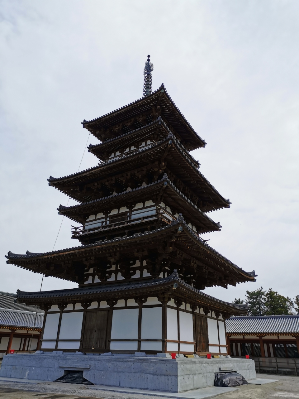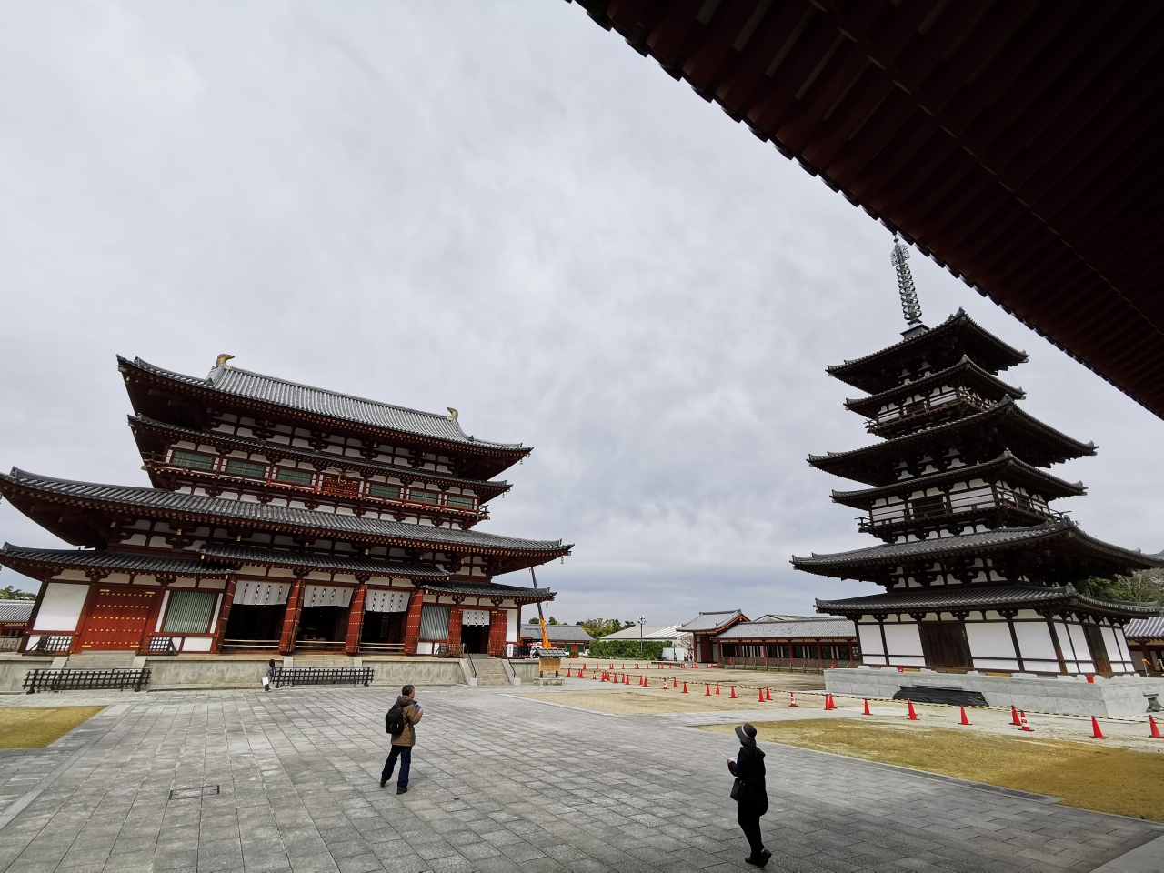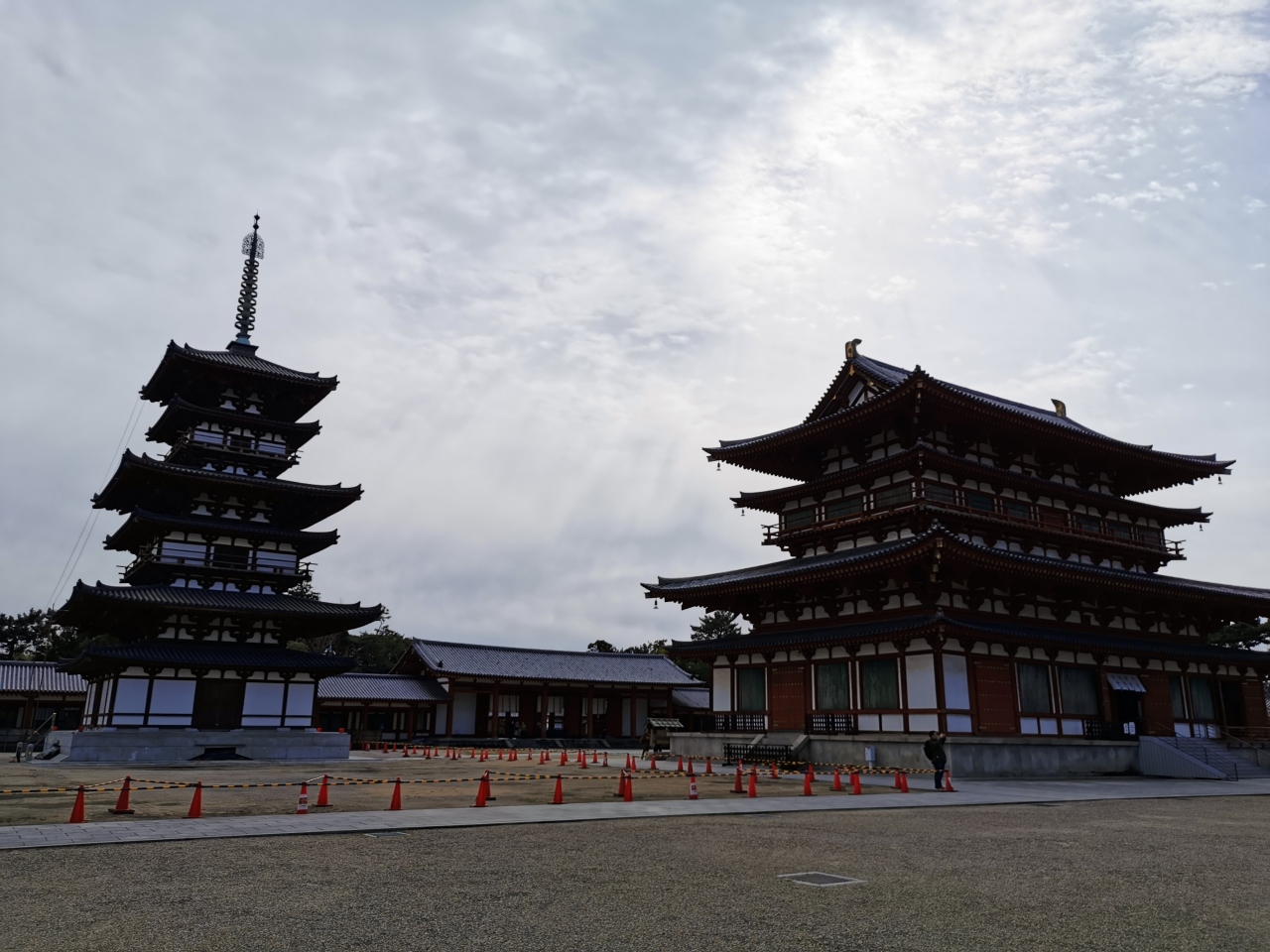 薬師寺の南門にある駐車場から歩きます。南門にある受付で拝観料をお支払い。目の前の「中門」を抜けて中央右側が「薬師寺東塔」。他の「西塔」「金堂」は昭和の事時代に再建されていますが創建当初から残る3重塔との事です。見るからに古くて立派。ただ修理との事で侵入禁止となっているので近づけず残念。
