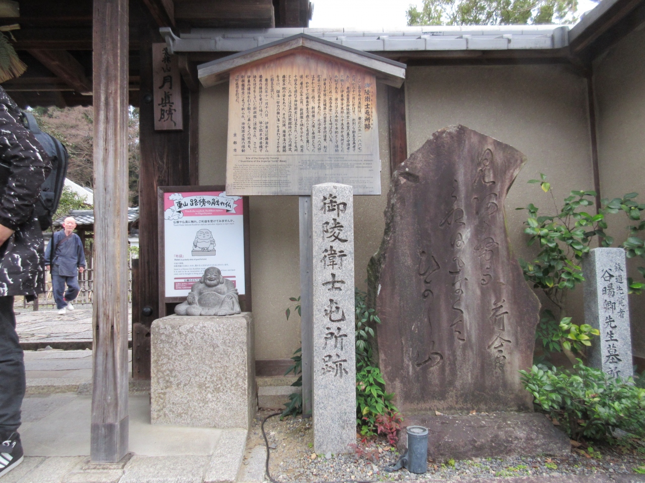 八坂神社から清水寺へ行く途中、「ねねの道」の近くに御陵衛士屯所跡の碑があります。こう真月院の門の横です。幕末には、禁裏御陵衛士を拝命した伊東甲子太郎以下15名が屯所を構えた場所で、院内には衛士が寝泊りしたとされる部屋も残っているそうです。