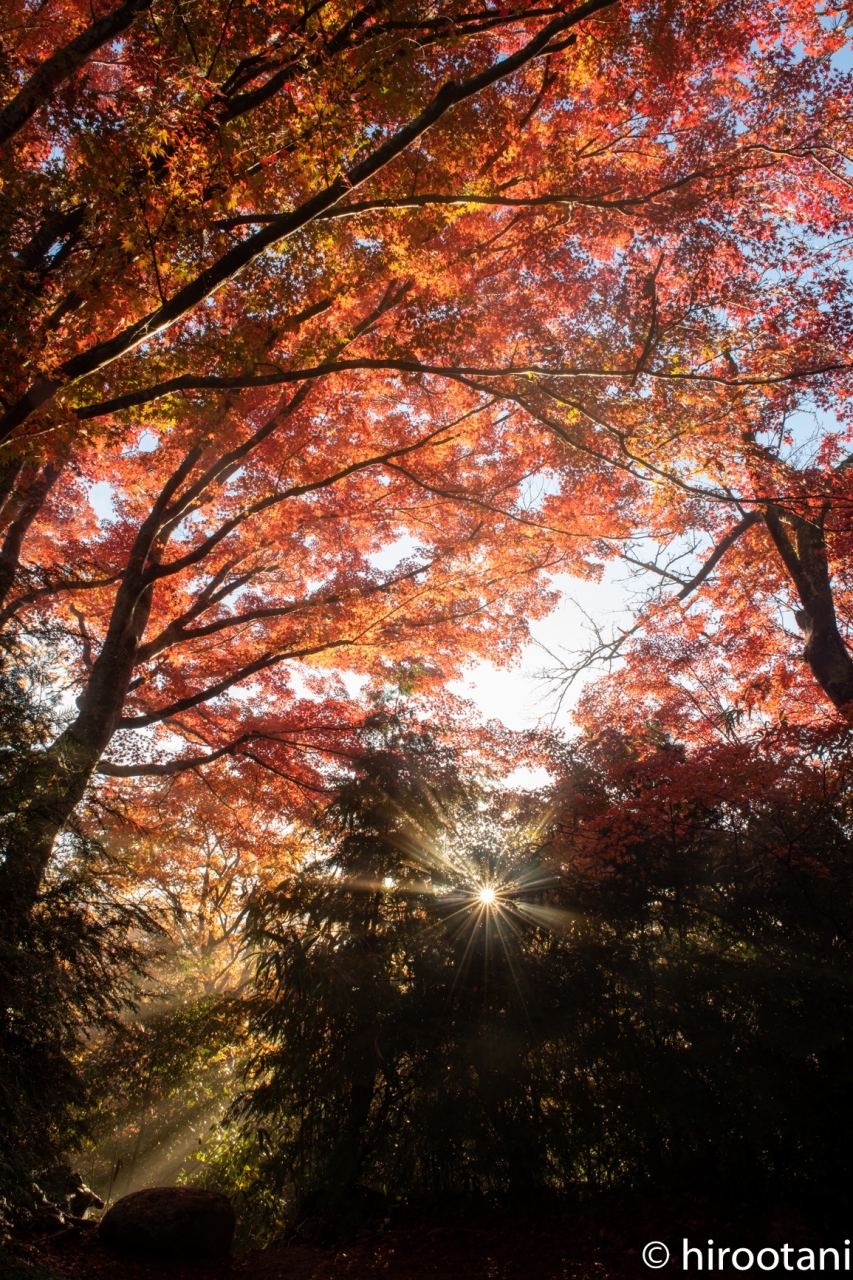 香嵐渓の紅葉を見にきたら、必ずこの山に登ります。夜明け前に山に登り、朝日がのぼるのを待ちます。ヘッドライト必須です。結構険しいので、ハイキングシューズも必要です。山頂付近の紅葉は本当に素晴らしい。そして、木々の間から昇る太陽を入れた写真を撮るのが恒例です。今回は、朝靄もあって、幻想的でした。