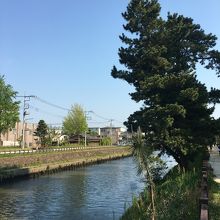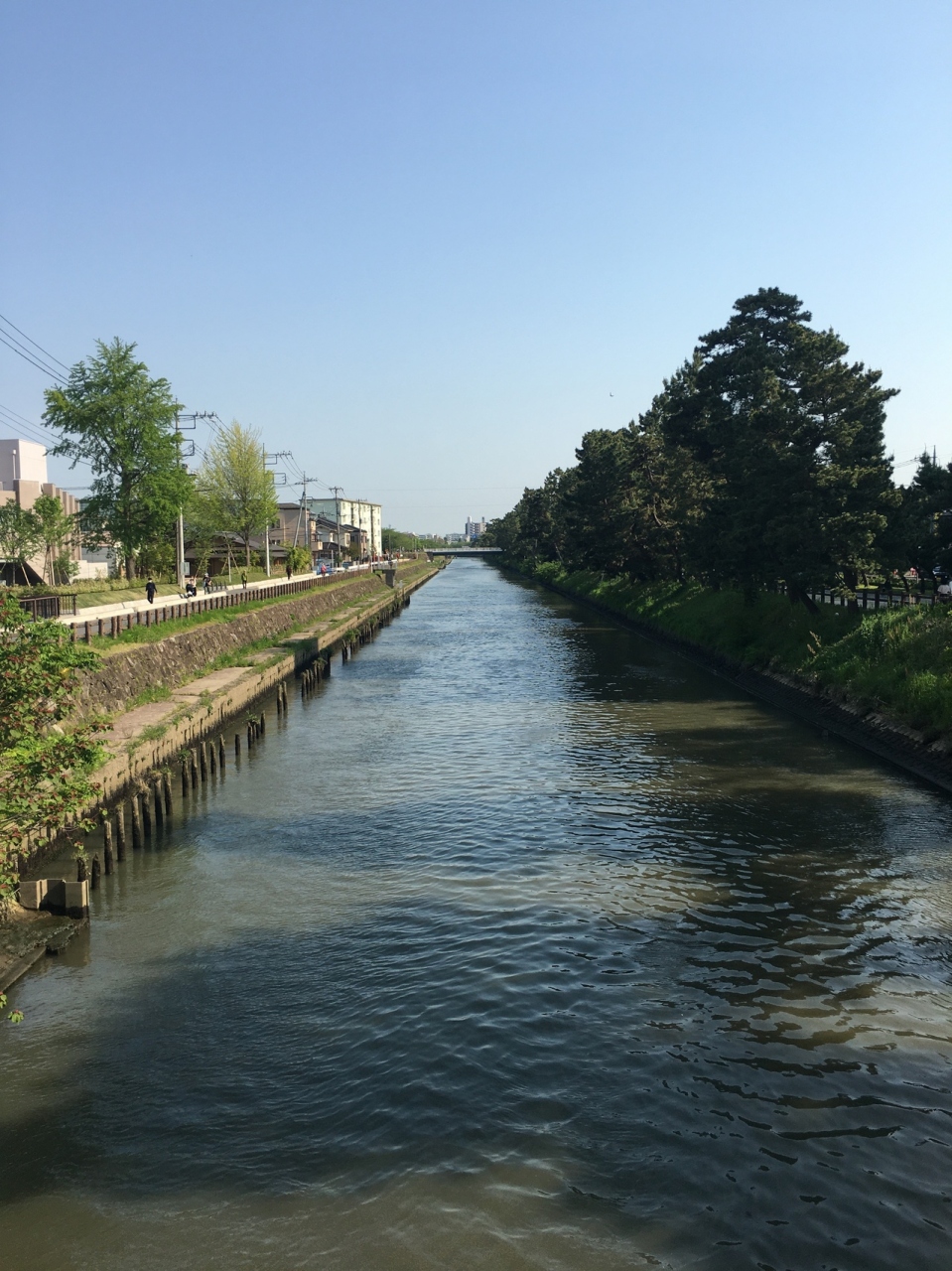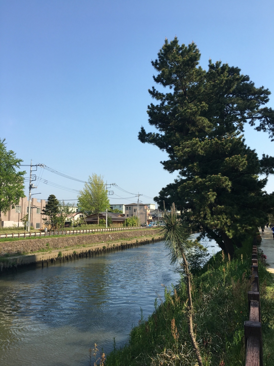川幅は広く無く、濁っている川でしたが、川沿いには松が植えられ、遊歩道になっていて、ランニングや散歩をしている人が多かったです。川は道より下にあり、いくつかの橋が架けられています。遊歩道沿いにも半円形型の橋があり江戸情緒ぽかったです。