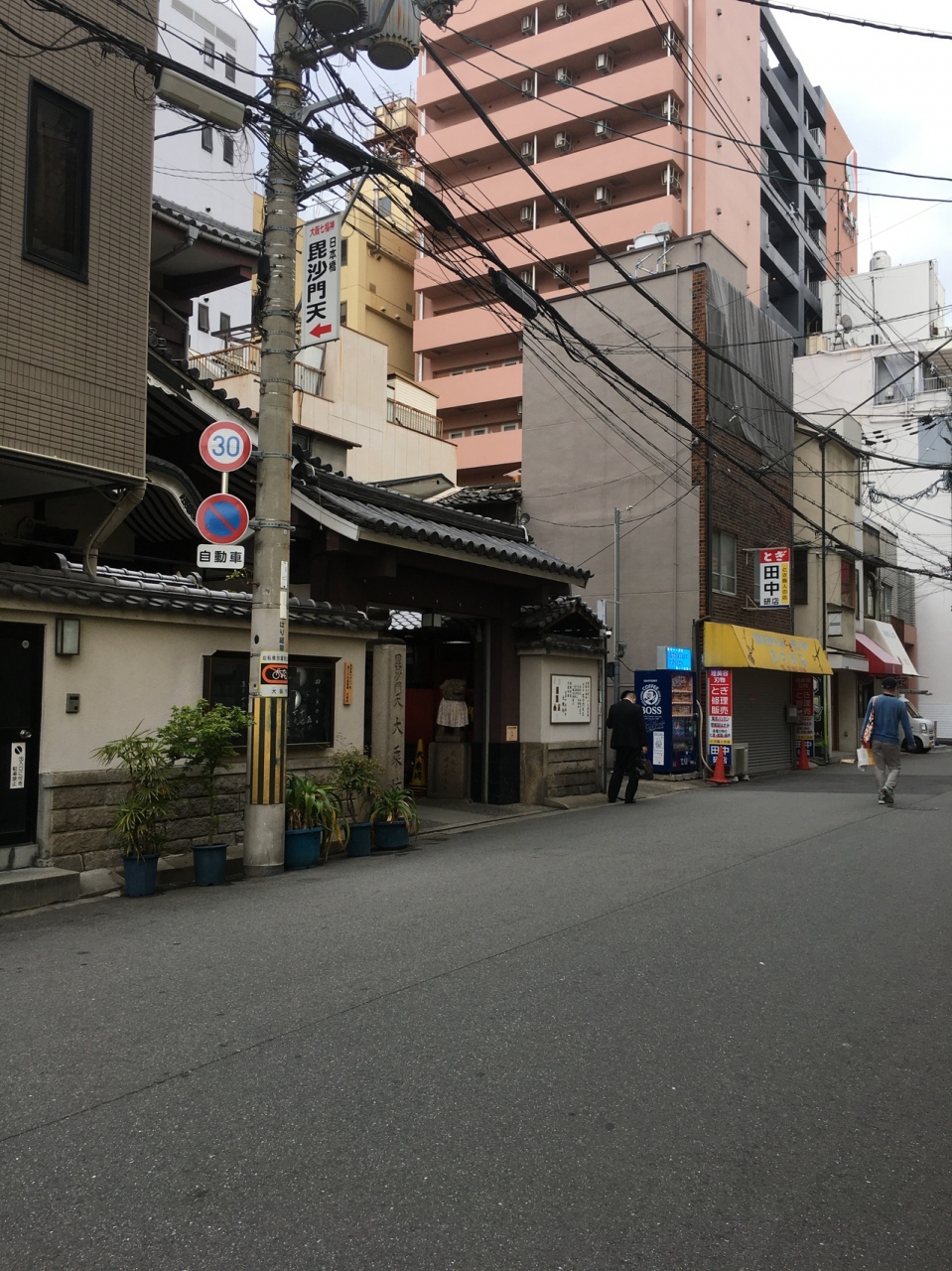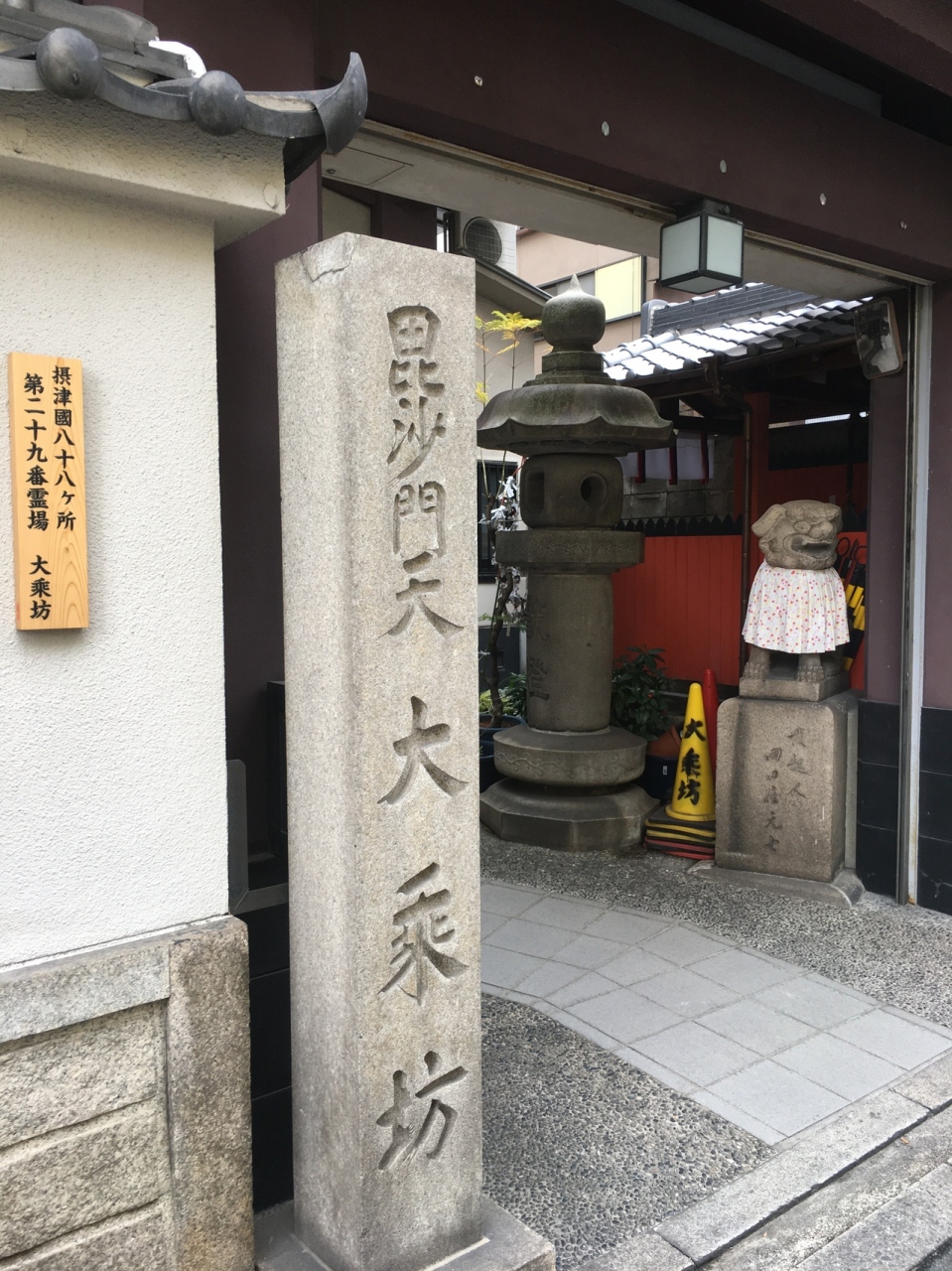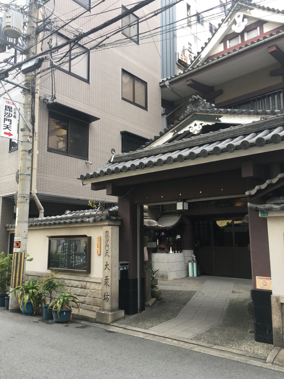 繁華街にある狭い境内で、中に入るとすぐに本堂で、瓦屋根が大きく目立ちました。本堂は、旅館のような外観ですが、灯籠が大きく、獅子の像もあり、細い木におみぐじがたくさん巻かれていました。不発処理弾の残骸が展示されていました。