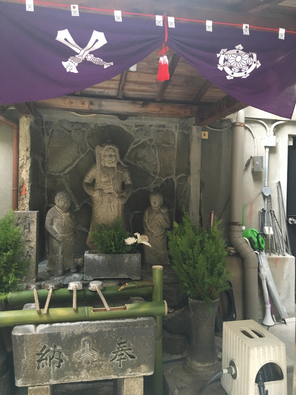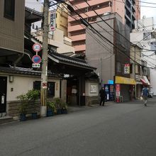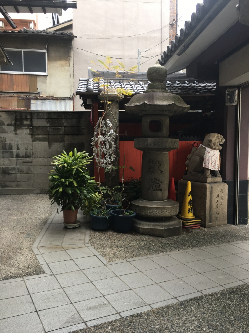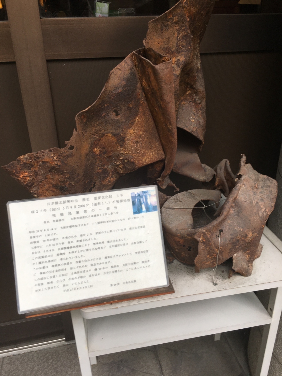 繁華街にある狭い境内で、中に入るとすぐに本堂で、瓦屋根が大きく目立ちました。本堂は、旅館のような外観ですが、灯籠が大きく、獅子の像もあり、細い木におみぐじがたくさん巻かれていました。不発処理弾の残骸が展示されていました。