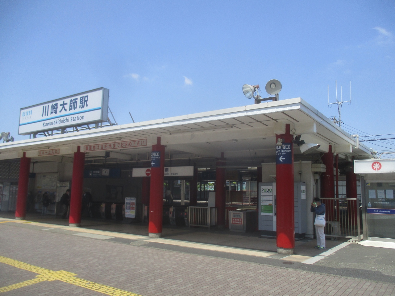 京急川崎で乗り換えて京急大師線を利用し川崎大師駅に到着しました。大師線は各駅停車のみのローカルな感じの電車で沿線の景色を楽しみながら移動できました。川崎大師駅の最寄りで駅の出入口は朱色の柱でなんとなく寺社を感じる駅舎でした。