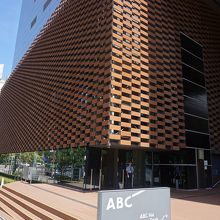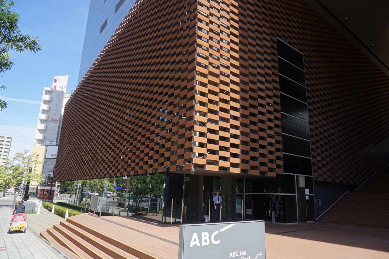 朝日放送テレビは、通称のABCテレビ。なにわ筋沿いの玉江橋たもと。建物がウッドデッキ風の壁でおしゃれだし、目立っています。テレビ局なんで、中とか入れるかなとも思ったんですが、ガードマンがいて厳しく規制。なんか視聴者からすると遠い感じです。