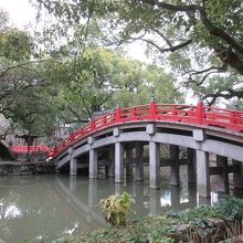 菅原道真の歌碑を見学した後、大宰府天満宮の本殿に向かう際、心字池に架かる太鼓橋と平橋を渡っていきました。冬枯れの季節でしたが、真っ赤な欄干が美しい橋は心字池に鮮やかに映えて、美しく感じられました。小さなお社も何か所があって、それらを見学しながら楼門に向かって進んでいきました。
