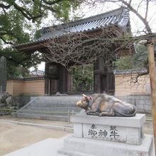 大宰府天満宮の参道を進み、鳥居を過ぎて先の境内の一角にあるのが、こちらの御神牛です。頭をなでると賢くなるとの言い伝えがあり、受験生と思しき人を含めて大勢の方が撫でていました。大勢の方に撫でられて頭がてかてかに光っていました。
