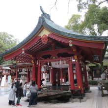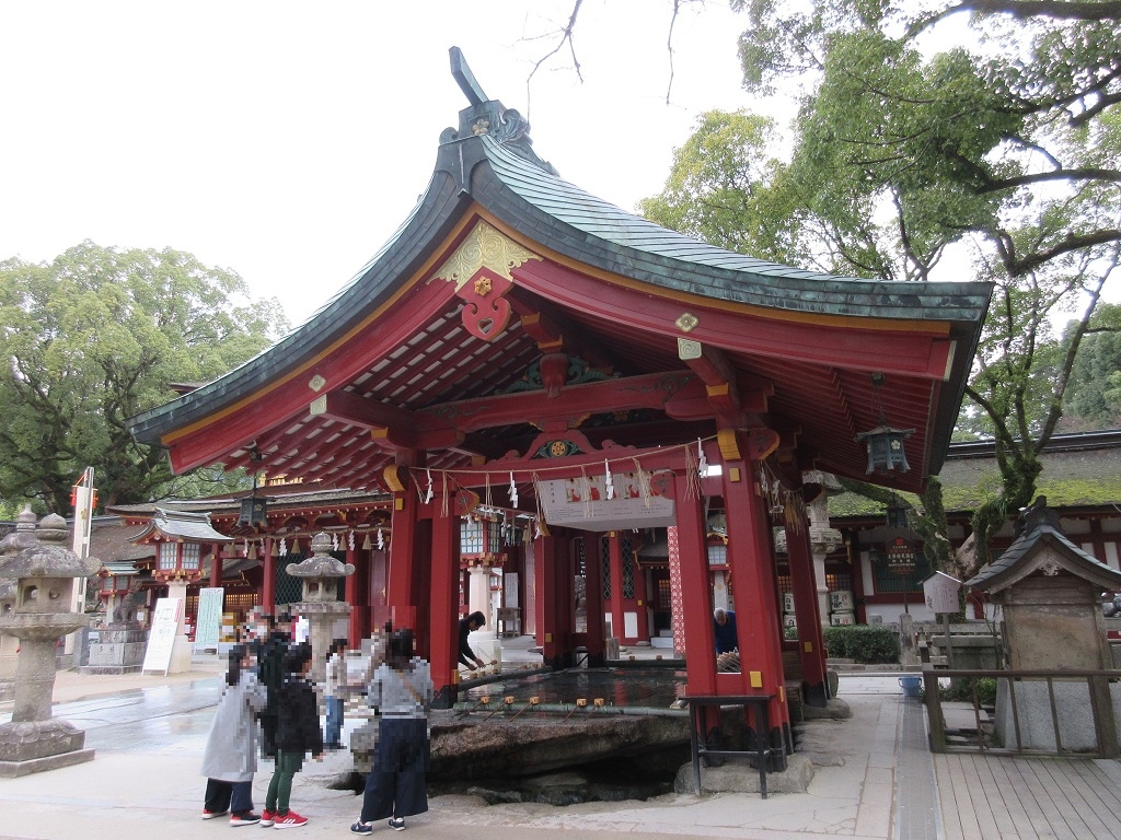 太宰府天満宮を見学した際、楼門をくぐる前に右手にあるこちらの手水舎に立ち寄りました。とても大きな手水舎で、大勢の参拝客が手を洗っていました。赤く塗られた柱や梁、青銅葺きの屋根のバランスが非常に良く、とても美しい建築でした。また、柄杓で礼儀正しく手や口を清めている参拝客の姿は、とても美しく見えました。