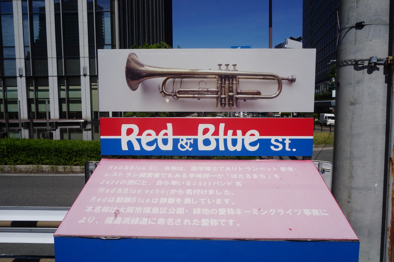 Red&Blue Streetは、ネーミングライツで付いた名前のよう。堂島川の田簑橋から玉江橋の間にある川の北側に設けられた遊歩道で、もともとは福島浜緑道。堂島川をはさんで南側には、美しい高層ビル群が眺められます。ただ、ここじゃないとダメという景色でもないし、人通りは少ないと思います。