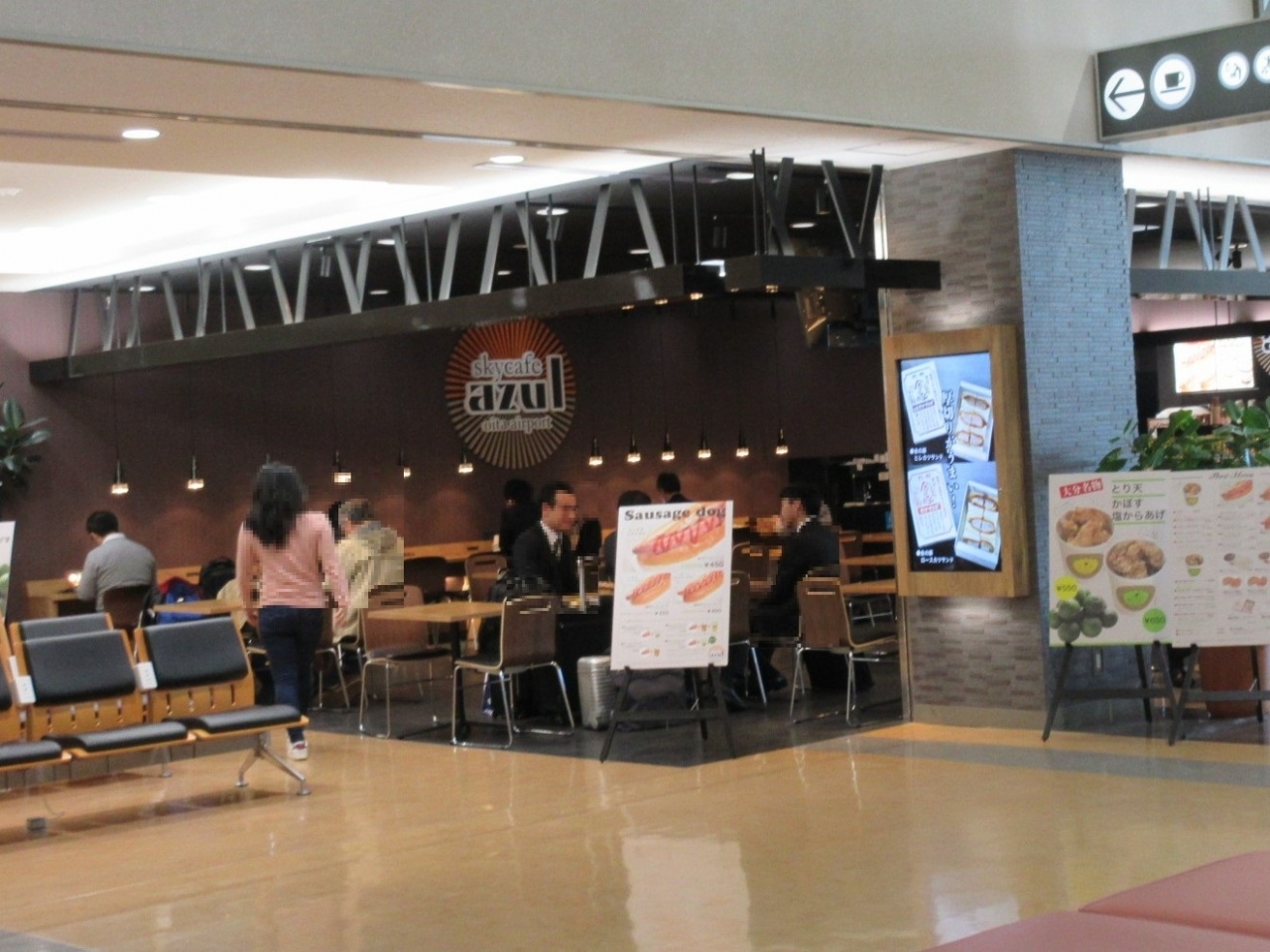 大分空港からの国内線を利用した際に、こちらのカフェで食事を頂きました。太いソーセージをはさんだ「ソーセッジドッグ」をオーダーしてかぶりつきました。他にも大分らしい「鳥てん」もあって、食べている方を見ているとそれも美味しそうでした。「アズール」という名前や看板がライブハウスかショットバーのようで、とてもユニークでした。