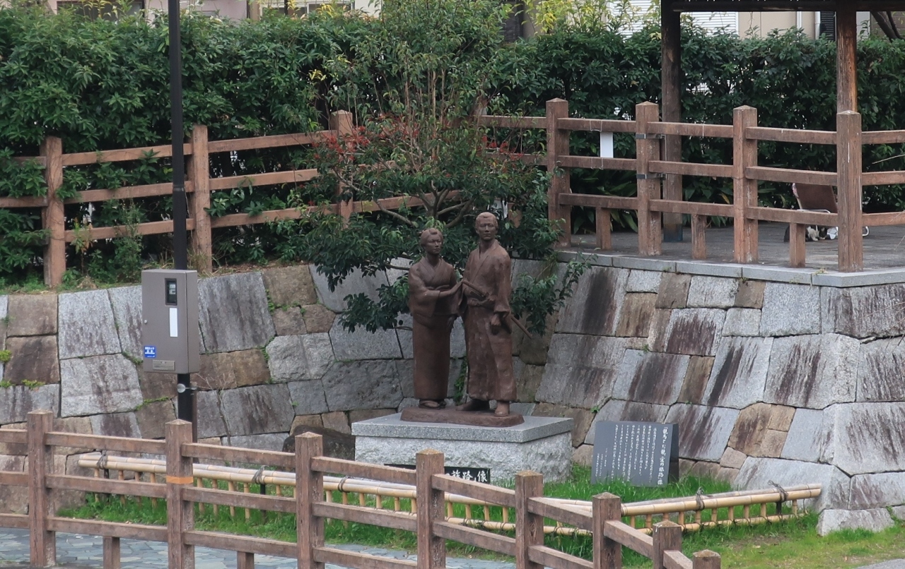 地元のライオンズクラブが2011年に建立した像だ。初めて新婚旅行を行ったカップルとして知られる坂本竜馬とお龍が旅立つ姿をモチーフにしている。すぐそばにある寺田屋に宿泊していた竜馬が襲われが、お龍の機転で難を逃れた。司馬遼太郎の『竜馬がいく』によると、これを機に結婚することになっている。竜馬の傷をいやす旅でもあり、薩摩の霧島の温泉に行ったという。記念撮影のスポットにいいかもしれない。