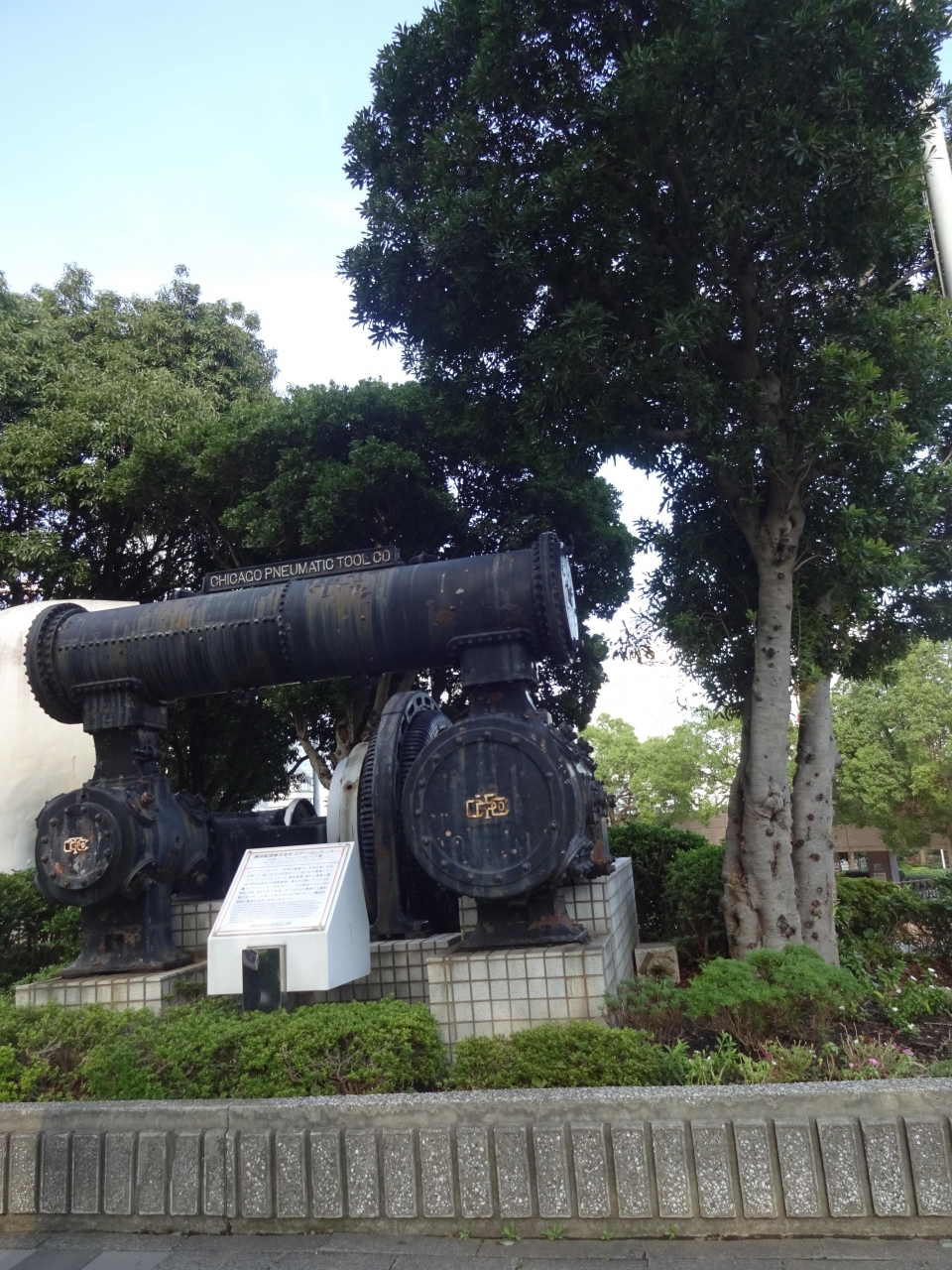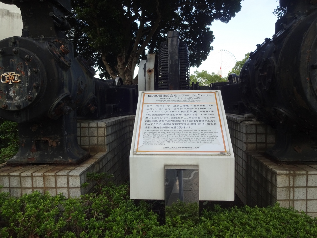 これはエアーコンプレッサーと呼ばれるもので、横浜船渠(後の三菱重工横浜造船)が造船業を始めるときにアメリカから購入した物だそう。