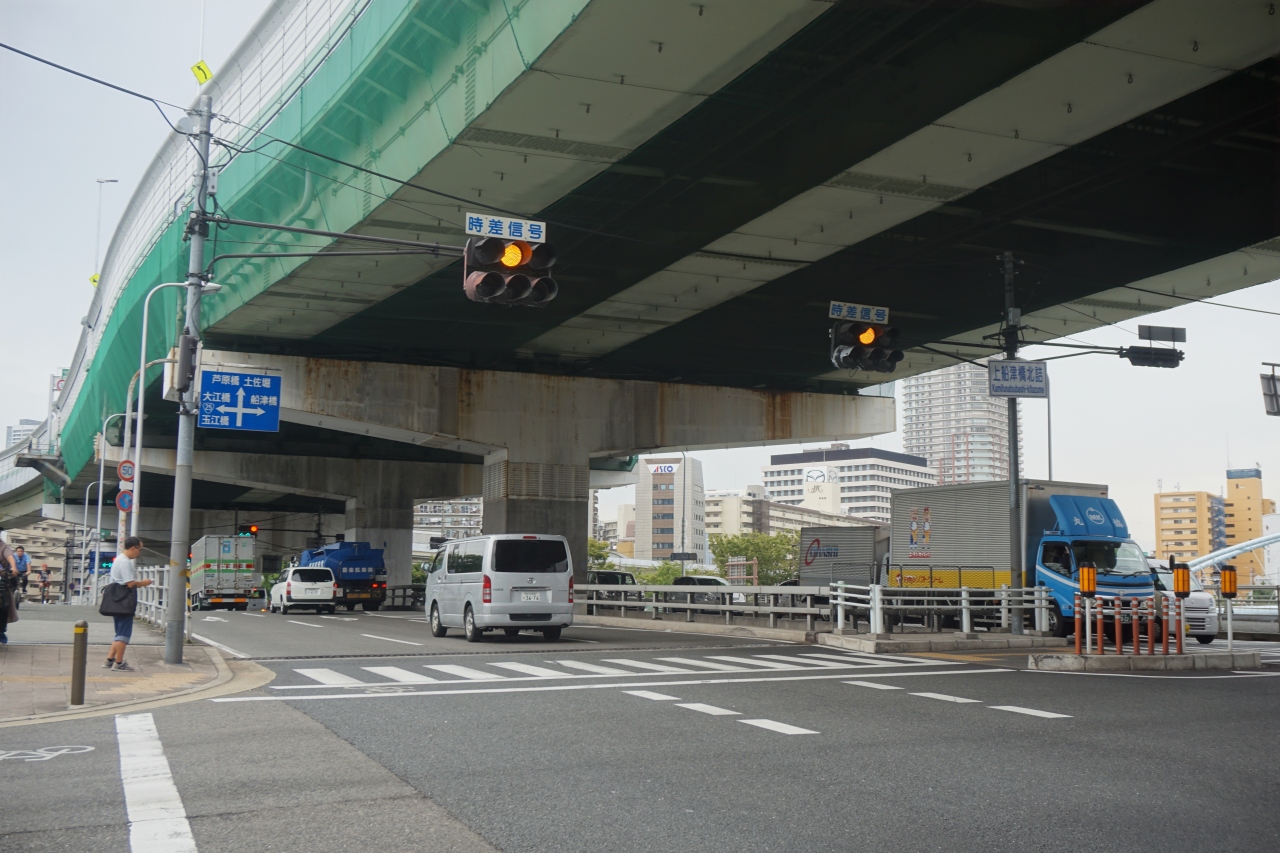 上船津橋は、新なにわ筋の堂島川に架かる橋。南側が湊橋で、阪神高速3号神戸線が高架になって覆って橋を覆っていて、産業道路風。その感じは湊橋からそのまま続いているような感じ。トラックとかが多く通るし、観光の要素はあまりないと思います。