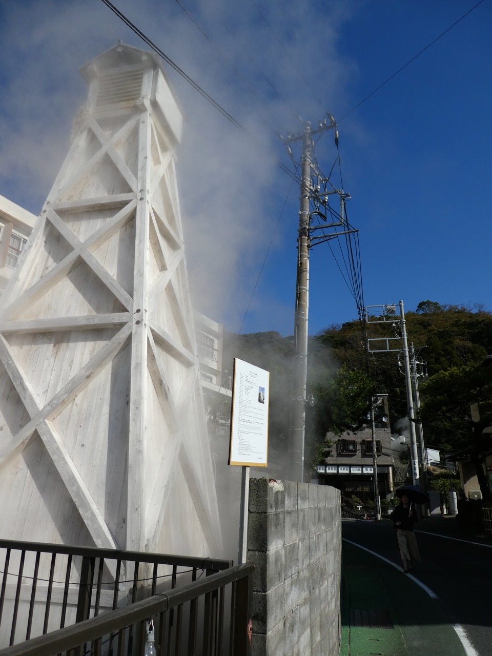 急な坂道を小川に沿って降りていくのですが、途中に温泉塔があって湯気がもくもく出ていたり、小川に赤い小さな橋がかかていたり、お湯かけ七福神があったりして、あまり飽きることなくホテルに着きました。海岸の眺めもよく、伊豆七島がくっきり。海岸にも足湯や温泉塔があります。