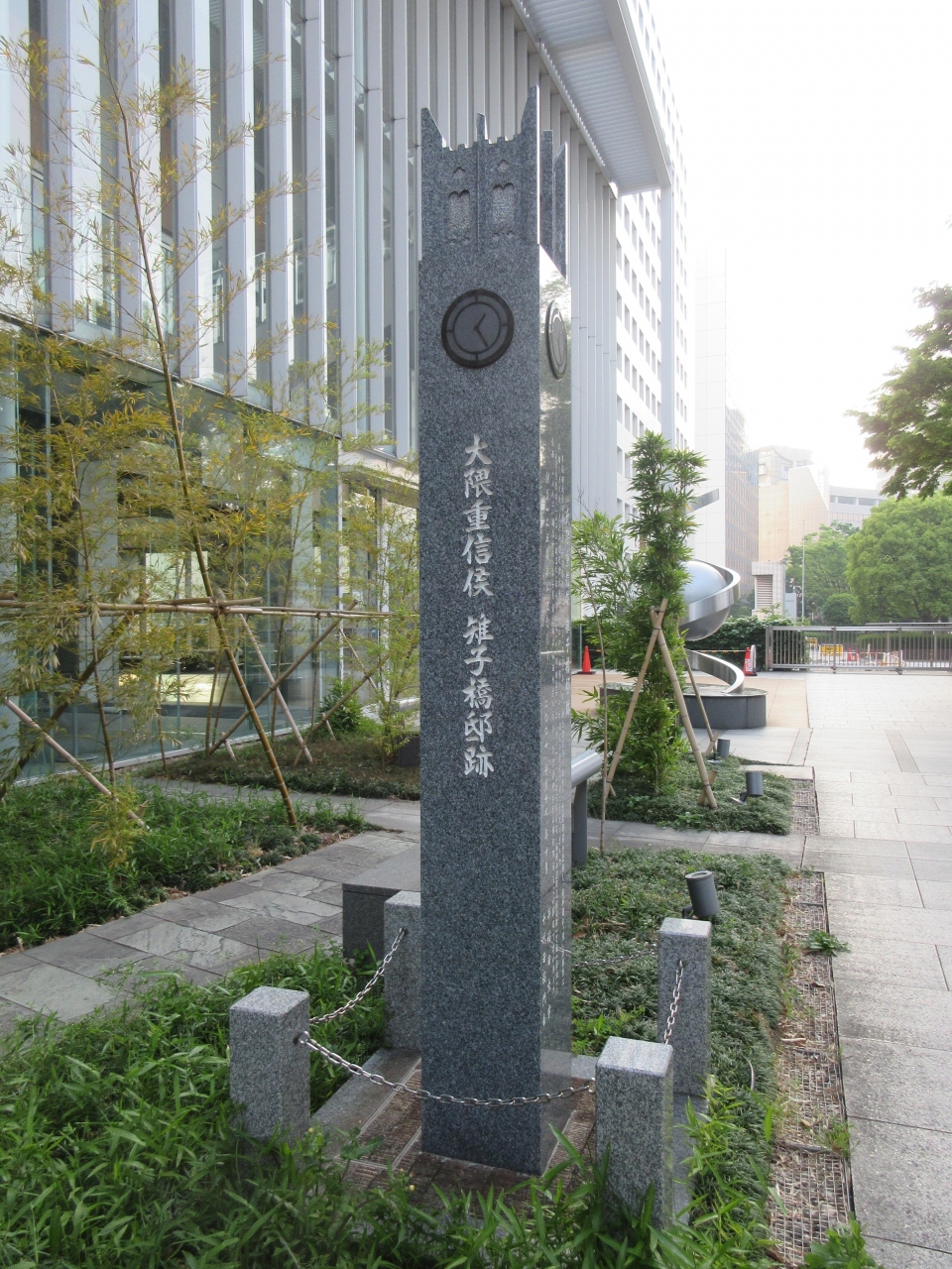 九段下駅から内堀通りを南へ数分歩いたところにある千代田区役所の前庭にあります。大隈重信が1876年から約8年間現在地に住んでいました。石碑は早稲田大学大隈記念講堂を思わせる石碑に大隈重信の紹介と邸宅について記されています。千代田区役所は企業の新しいビルのようで、石碑は建物と歩道の間にある前庭にあるオブジェのようでもありました。九段下周辺を散策する際に洗練された石碑を見に寄ってはいかがでしょうか。