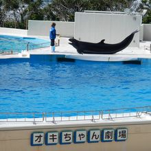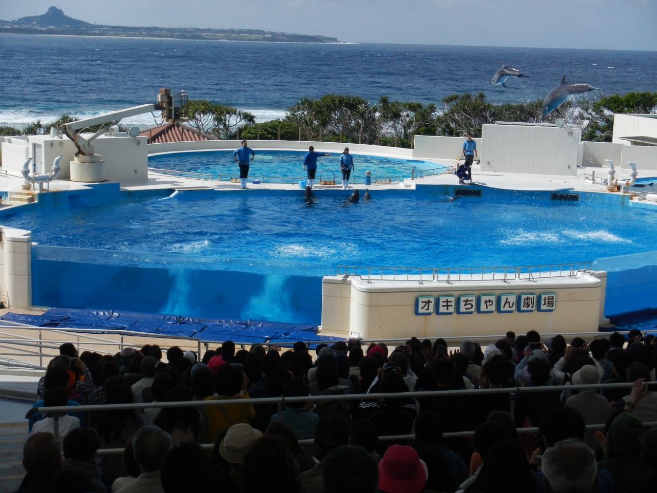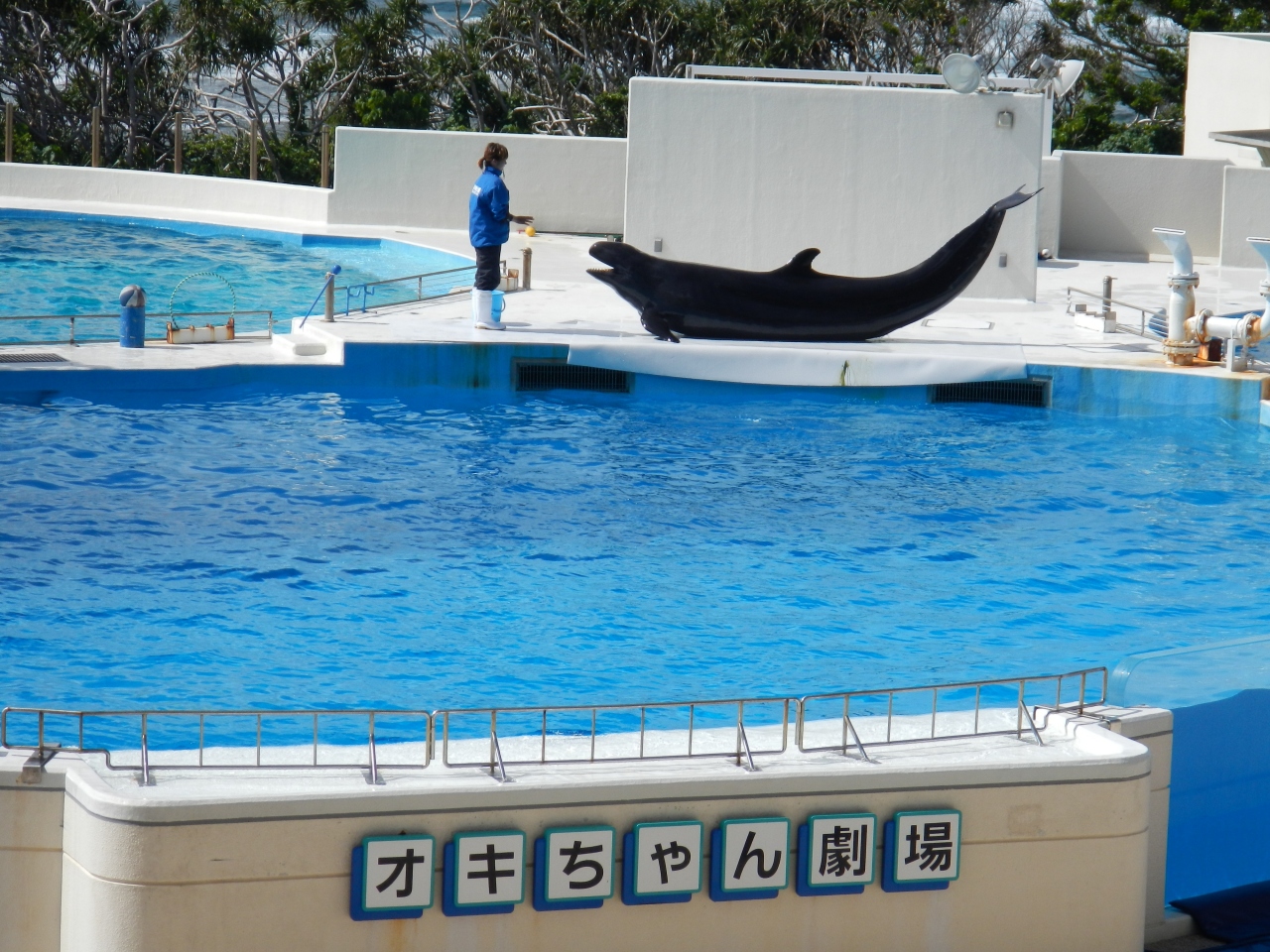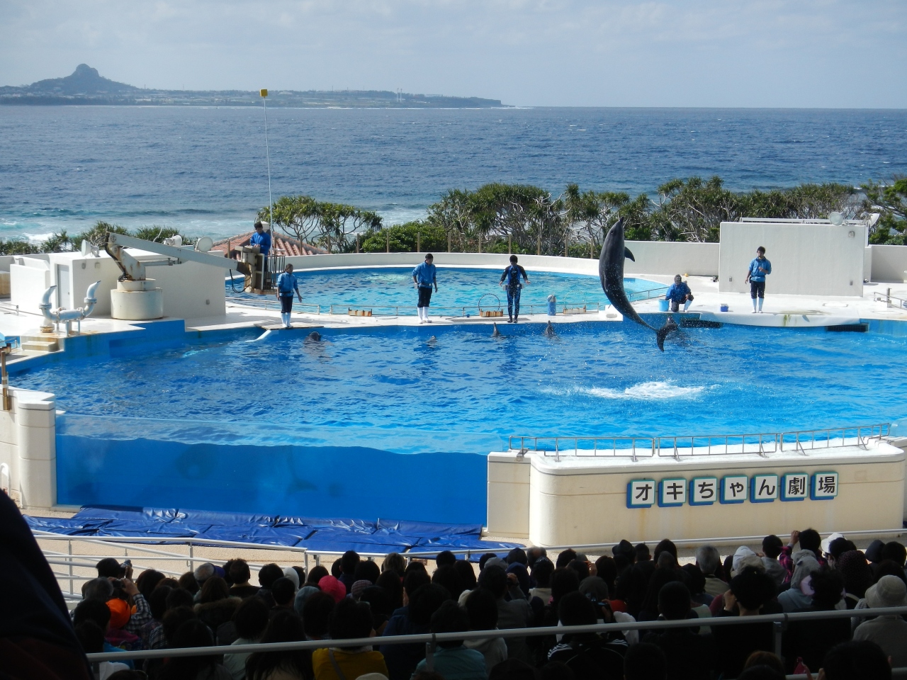オキちゃん劇場では、青い海をバックに、海洋博公園のアイドル、イルカのオキちゃんとその仲間たちが楽しいショーを繰り広げ、ミナミバンドウイルカ、オキゴンドウたちのダイナミックなハイジャンプ、ユーモラスなダンスやコーラスなどを存分に楽しめます。