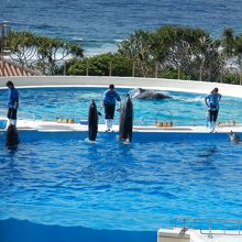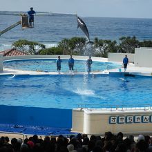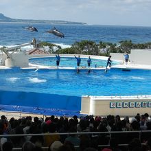 東シナ海と伊江島を背景にイルカたちがダイナミックなショーを繰り広げる「ショープール」と、水中のイルカをガラス面から観察しその生態を学ぶことができる「ダイバーショープール」を併設。