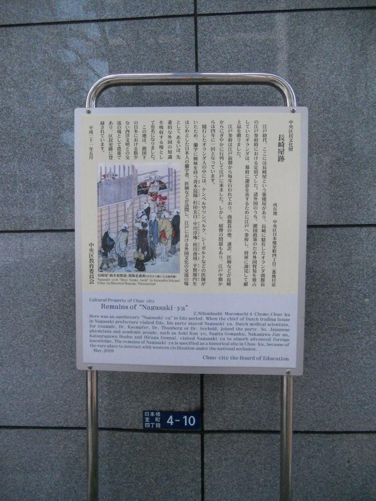 新日本橋駅からすぐのビルの1階に説明板がある「長崎屋跡」。