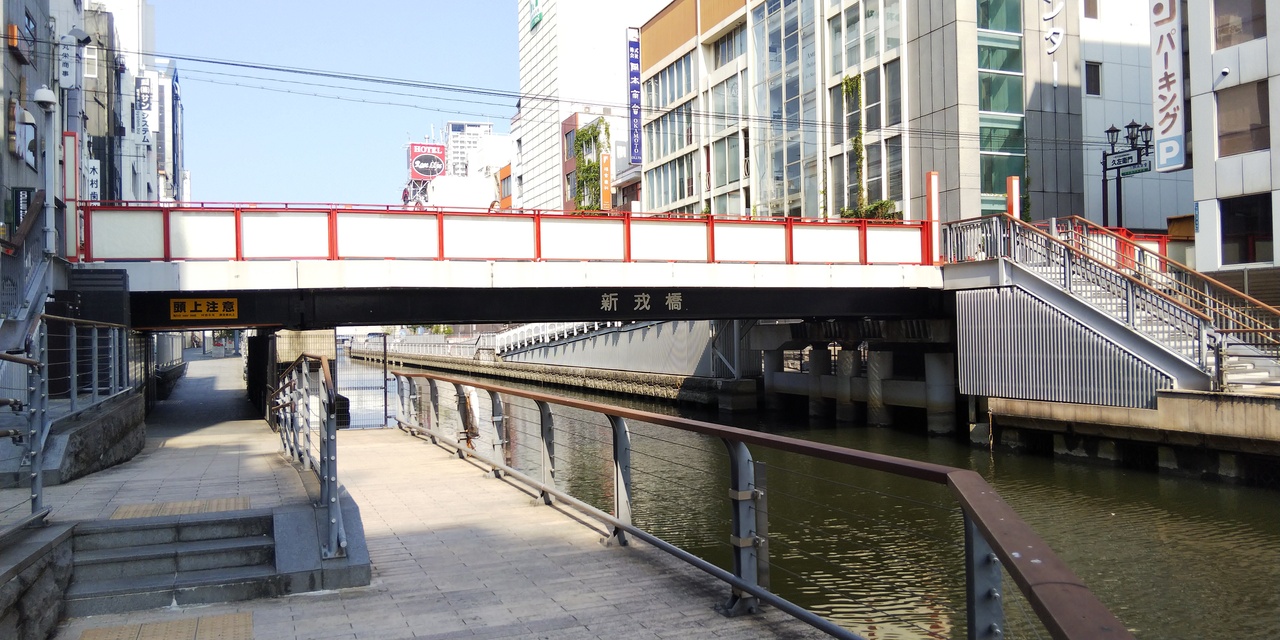 大阪ミナミの道頓堀川にかかる橋です。メインストリート・御堂筋にある道頓堀橋の1本西側にあります。道頓堀橋の逆側にある戎橋は観光客もたくさんいて賑わっていますが、こちらの新戎橋は通勤と思われるスーツ姿の普段使いのヒトが多かったです。川沿いのとんぼりウォークからの眺めもいいですよ。