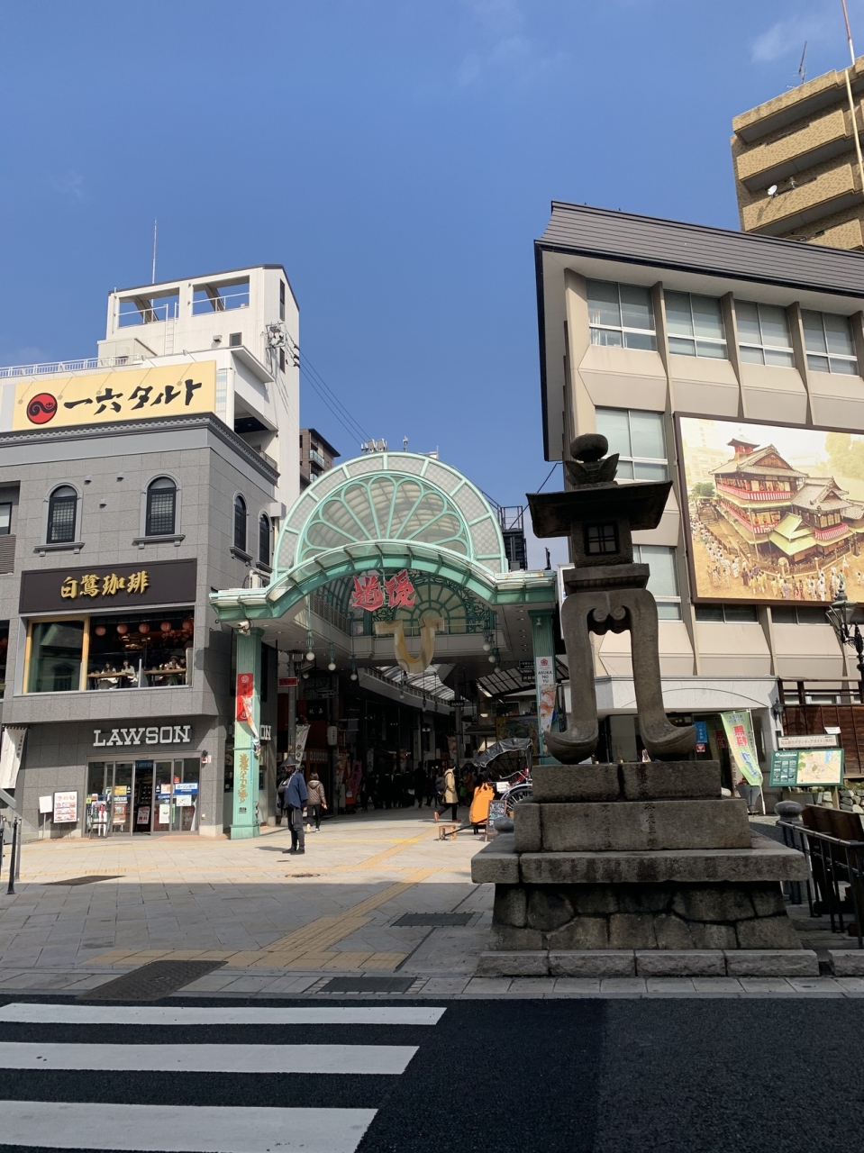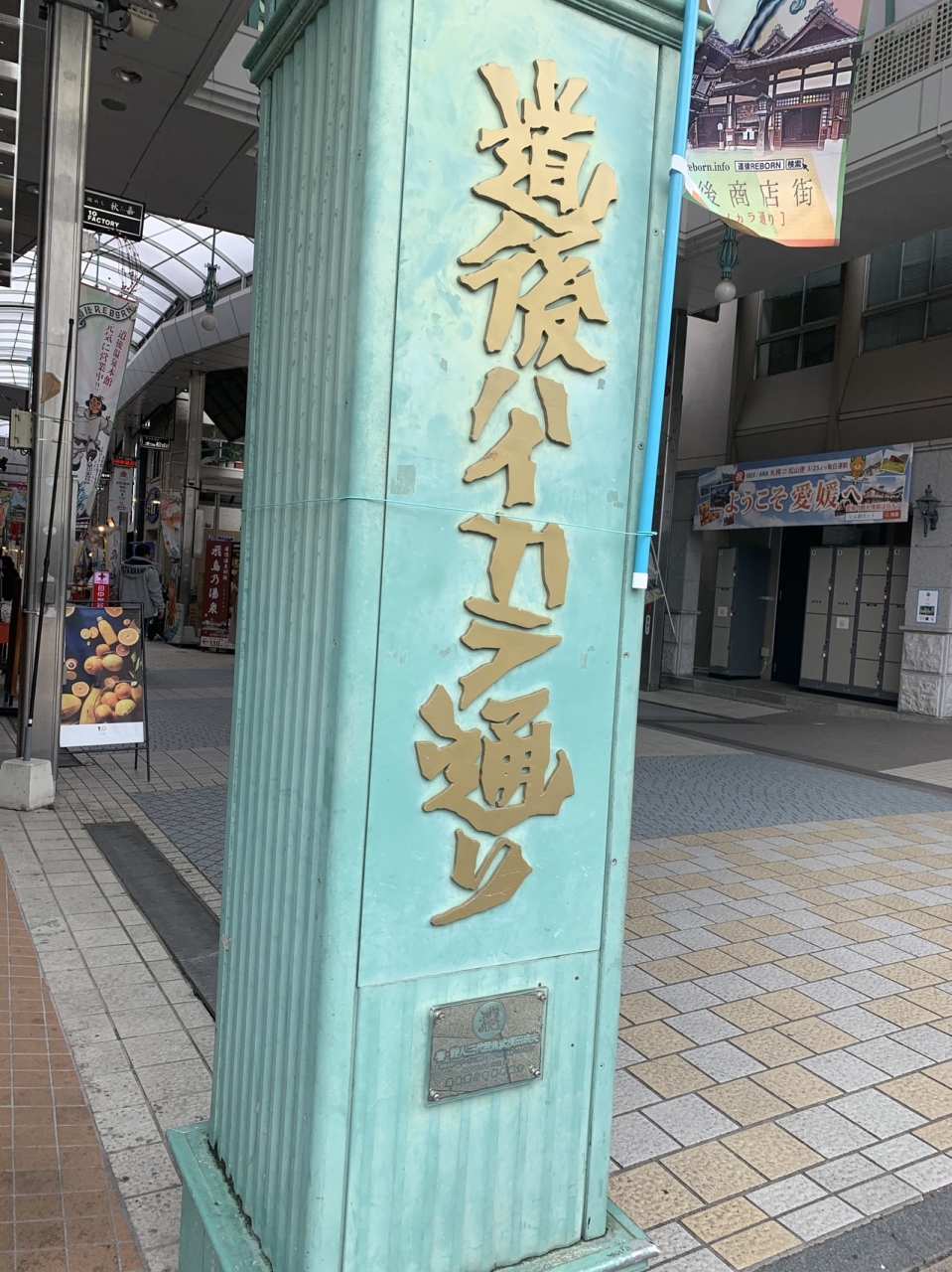 道後温泉の商店街です。たくさんの飲食店やお土産屋さんが立ち並んでいます。天井がアーケードになっているので急に雨が降った日でしたが利用しやすかったです。ハイカラ通りの入り口にある観光案内所にはトイレやコインロッカーがありました。
