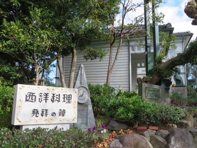 百葉箱のような真っ白な建物の自由亭があります。いかにも西洋料理といった外観です。この前に西洋料理の碑があり、この横に西洋料理の開拓者の草野丈吉さんの像があります。西洋料理は16C中ごろポルトガルの来航に始まりました。この3点セットはいかにも西洋料理の雰囲気です。