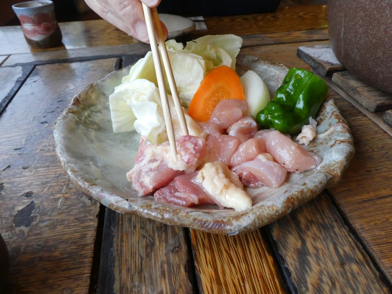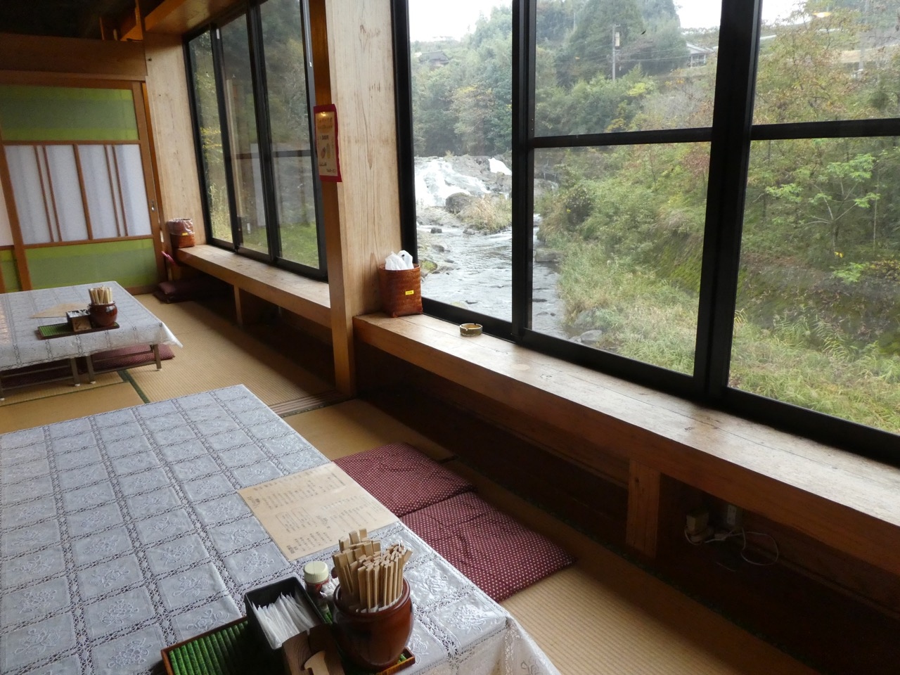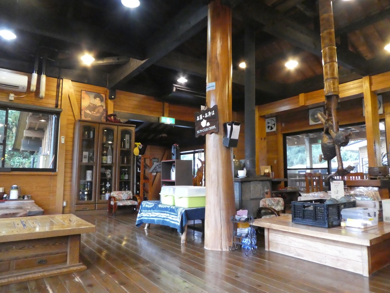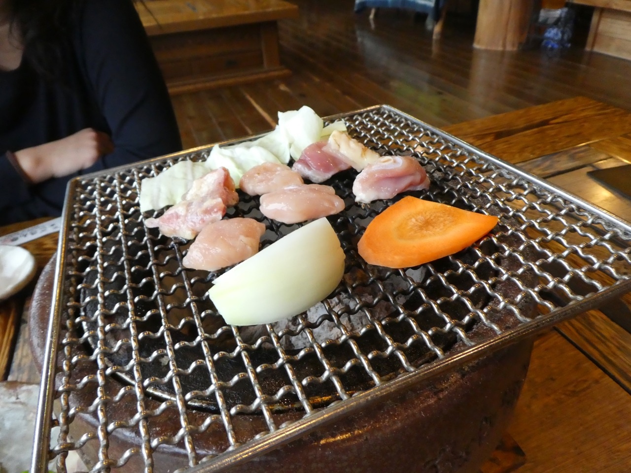メニューにイノシシ肉が目立っていたのでうどんと焼肉をそれぞれ注文。ちょっと野性味があるかなというやや硬い豚肉といった感じでした。焼肉の方は炭の入った火鉢が持ってもられて自分で焼くタイプ。懐かしいです。なので時間がかかります。ちょっと燻され感はありますが天井が高いのでさほどでもなかったです。訪問時はコーヒーやお茶がセルフでした。お茶は前回の夜もそうだったのですが、コーヒーは案内がなかったのですがランチのときだけかも。滝が見える窓辺での野生の味