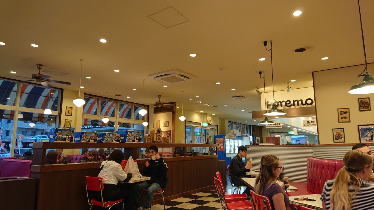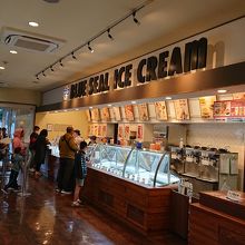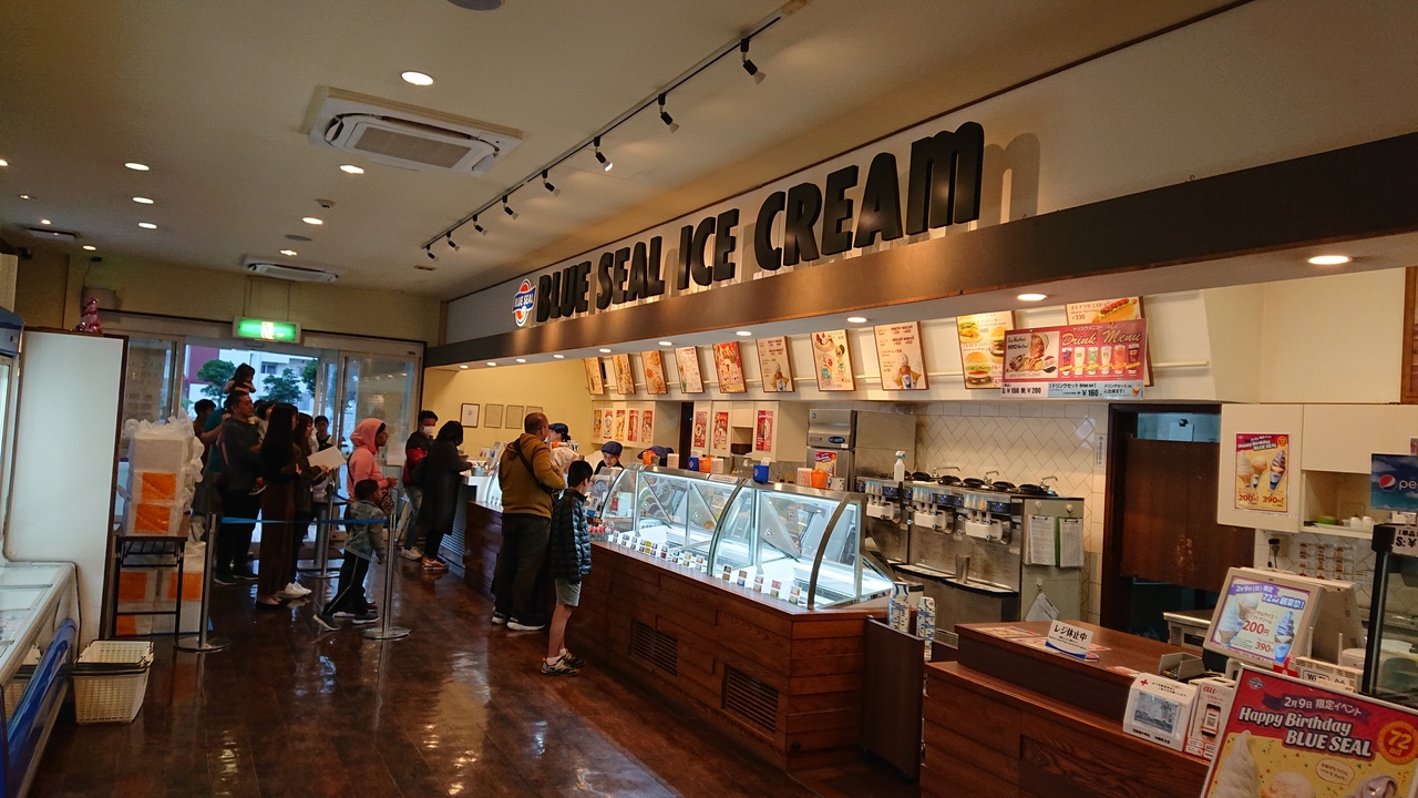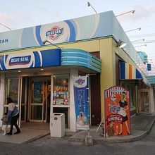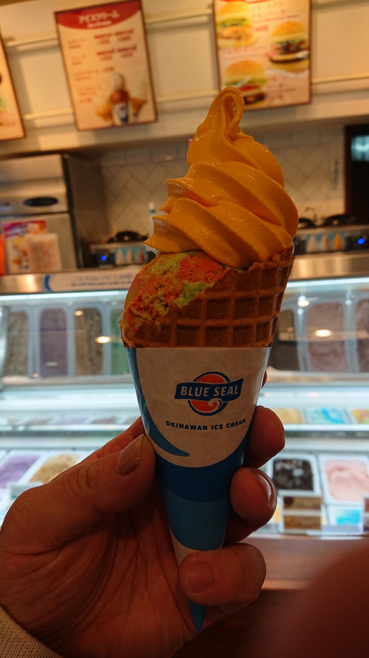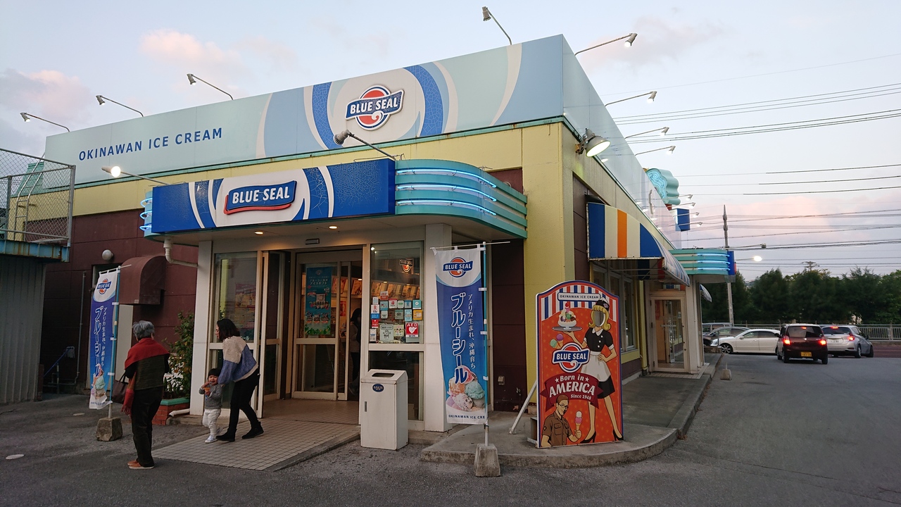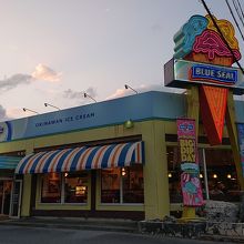 国道58号線(名護方向)、北谷町美浜のアメリカンビレッジの入口近くにあるブルーシール。牧港本店に次いでオープンした2号店で、アイスのほかにバーガー類やホットドッグなども楽しめる。白黒のブロックチェックの床、赤いソファなど、ブルーシールアイスクリームのアメリカンテイストがいっぱいのお店は、本土ではなかなか味わえない雰囲気。直営店なので、もちろん10日と20日は、Big Dip Dayを開催。シングル価格で3つのフレーバーを楽しめます。目の前は米軍基地なので、米軍関係者も思われるお客さんも多いのも、このお店の特徴かも。沖縄に行ったら必ず通ってしまうお店の一つです。