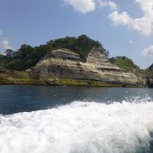 折り重なる火山灰層が美しい崖を間近に、水しぶきを上げて進み、爽快です。