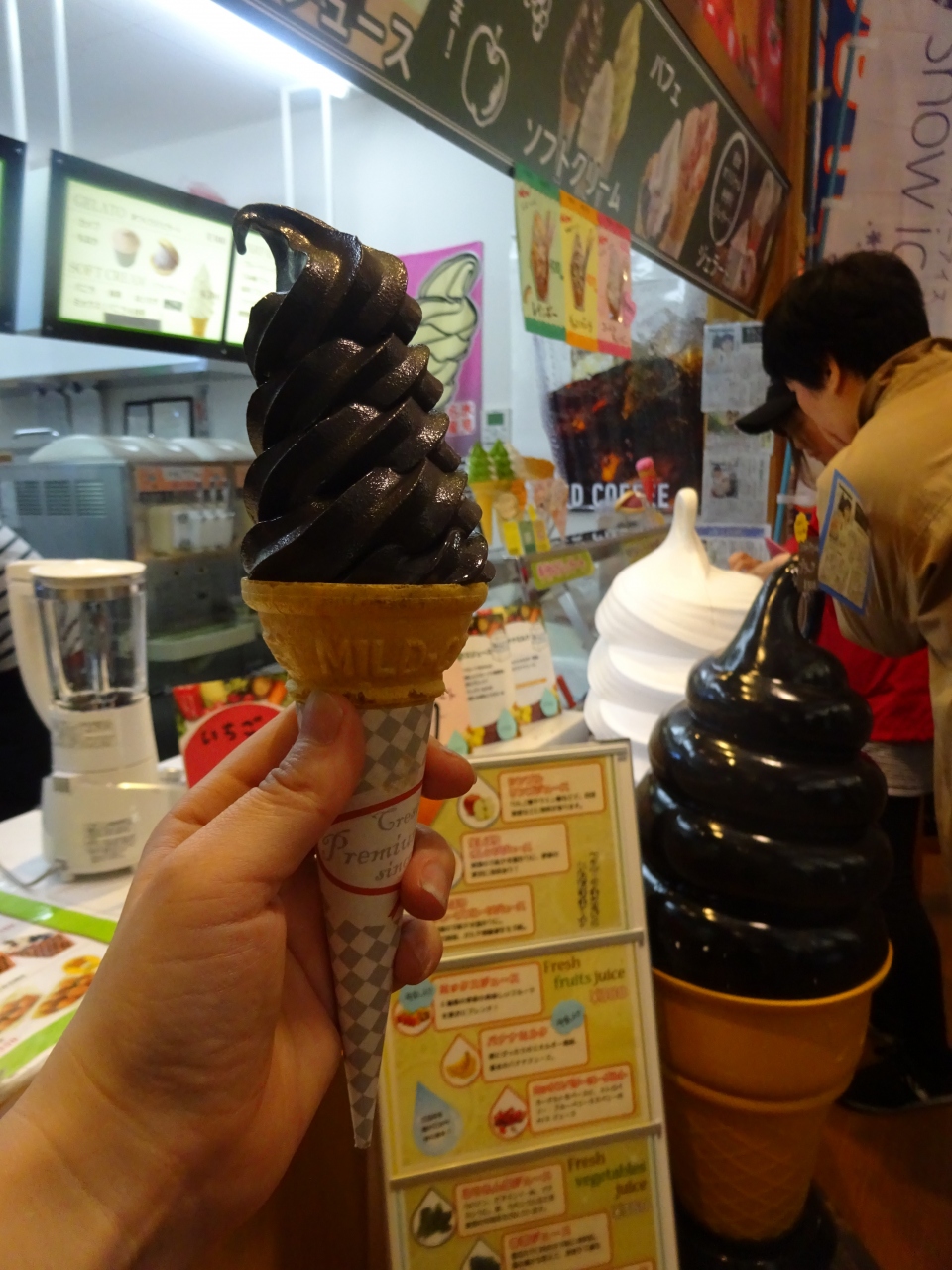 初夏の日差しの洗礼を受け、デザートとして「ブラックソフトクリーム」なるものが気になって求めました!竹炭入りだそうで味は甘すぎないチョコレート味♪