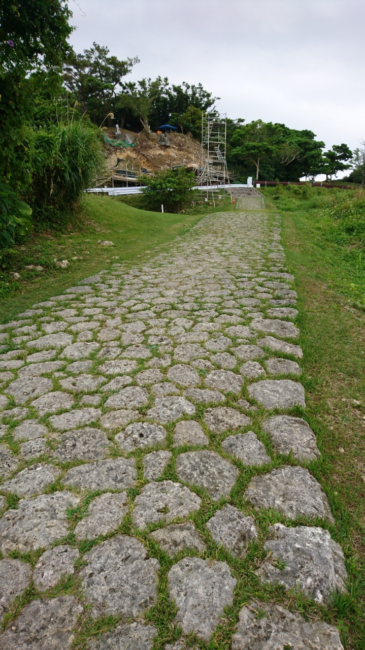 そちらに駐車場もありました。駐車場の横から石畳がありグスクへいく道があります。