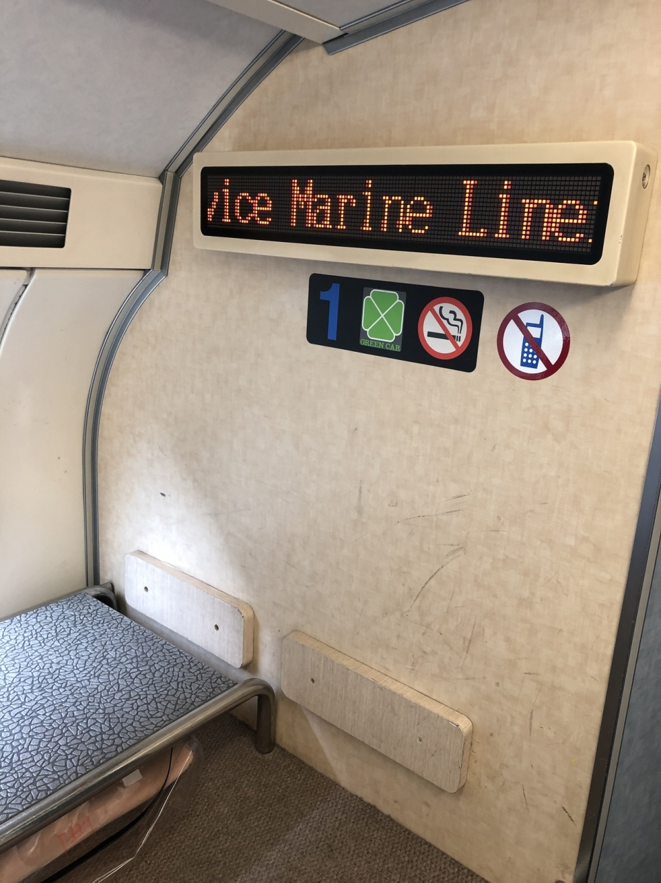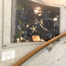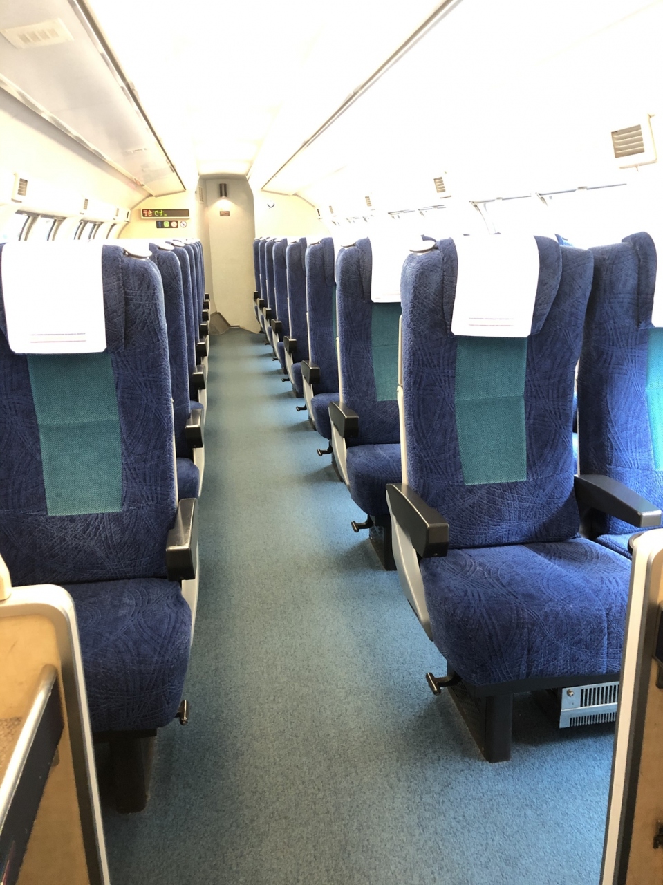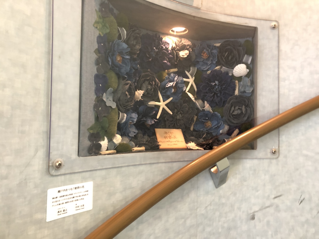 どうせなら少しでも見晴らしの良い席を求めてグリーン車の二階に乗りました。階段で上がるのですが、途中紺碧の瀬戸内海を表した花の作品が展示されております。車内にこういう作品が展示されてあるのは経験がなく、グリーン車の高級感を感じられました。