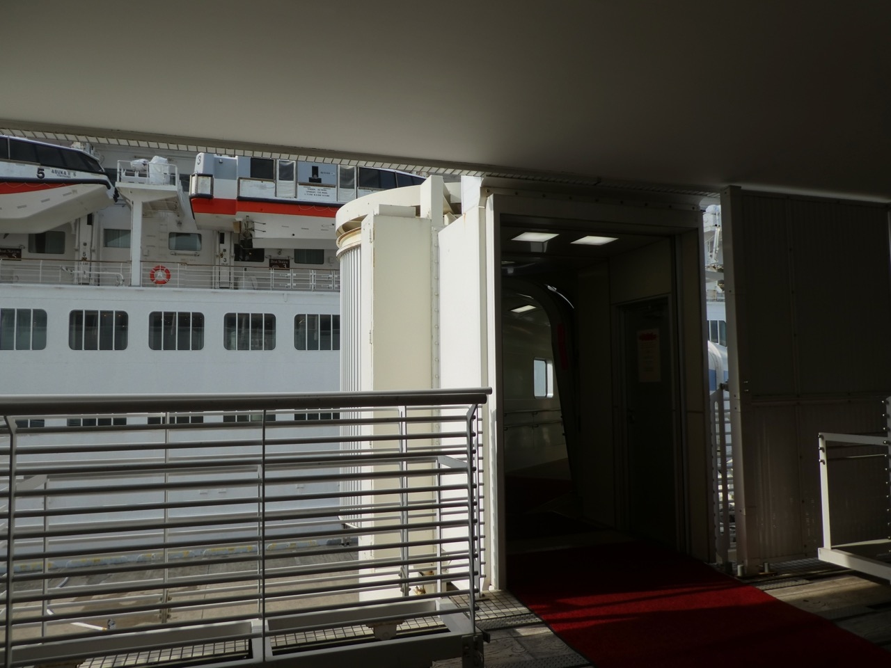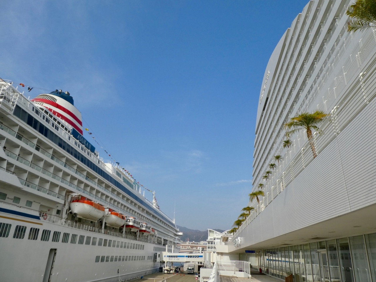 今は大きなオリエンタルホテルが建っていて、その下層2階分が客船ターミナルになっています。しばらくはさんふらわあもここに停まってました。ホテルの東西に乗り場があって東側は港内レストランクルーズ船。西側に、にっぽん丸や飛鳥はここに停まるのが普通のようです。乗船口に赤カーペットが敷いてあっておおっと思いました。