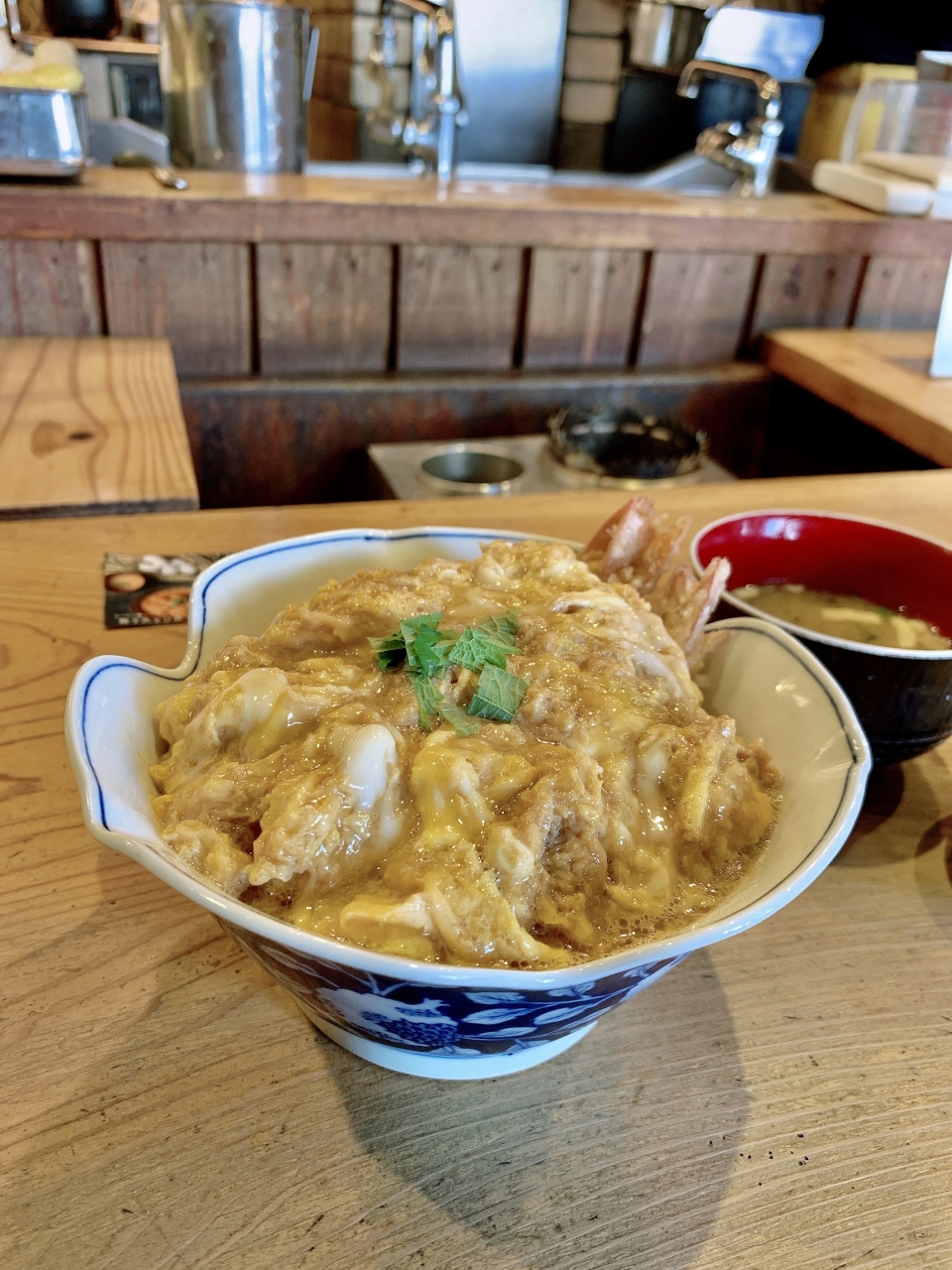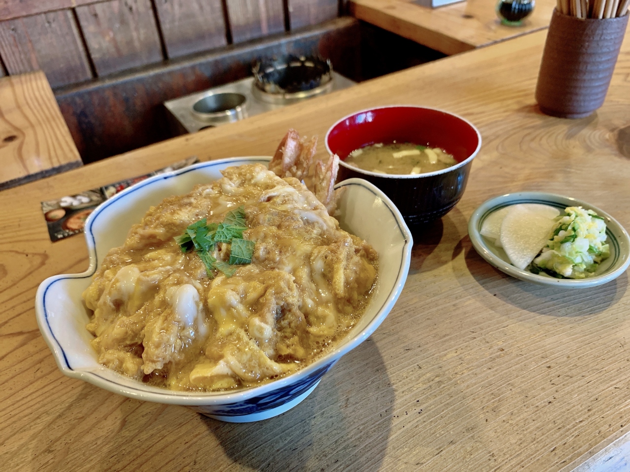 頂いたのは「海老天とじ丼」です!他に「親子天とじ丼」「チキンカレー」がありましたよー店内で食されている人やテイクアウトで買われて行く人と様々でした。