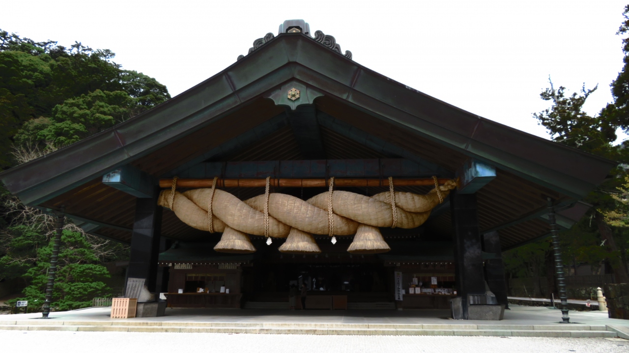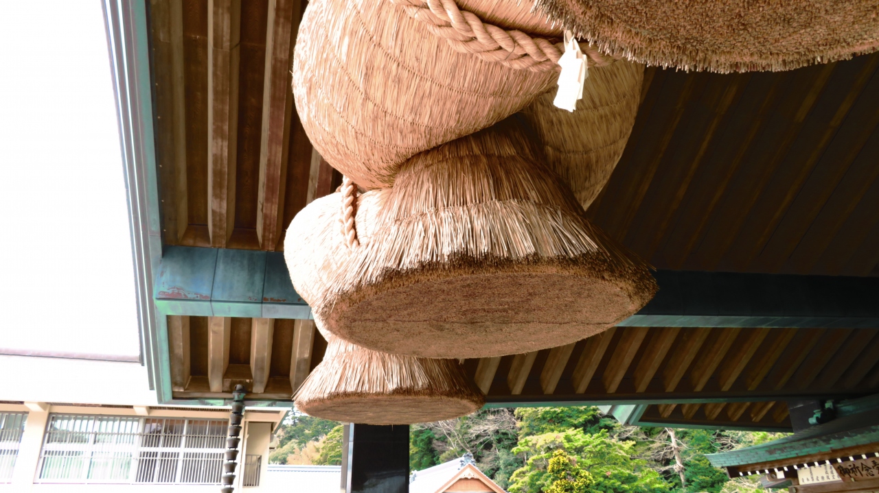 出雲大社の拝殿にも大きな注連縄がありますが、こちらの神楽殿の注連縄は拝殿のものより大きく、迫力があります。注連縄の真下に立てば、その大きさに更に圧倒されます。