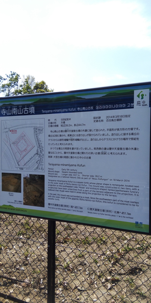 寺山南山古墳は堺市にある大仙公園の南側にあります。履中天皇稜の外濠ぞいにあり、陪塚と考えられています。墳丘は二段で築かれ、南東部には作り出しもありました。5世紀前半に築かれた方墳です。最寄り駅はJR阪和線の百舌鳥駅で歩いたら15分かからないぐらいだと思います。