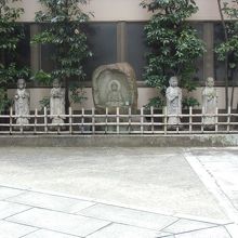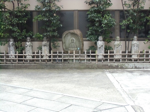山門正面に鎮座する小さな観音様の石像とそれを守るように並ぶ6体のお地蔵様が印象的でした。