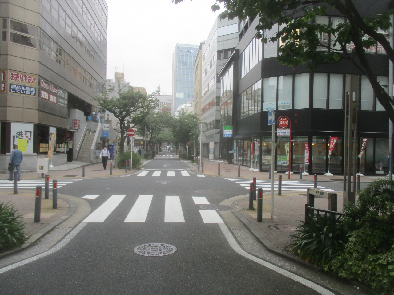 JR関内駅から神奈川県警へと続くオフィス街の通りです。駐車している人がいるので、車1台が通行できるような狭い通りになっています。通りの両端には実際に八重桜の木が植えられており、4月上旬から下旬にかけてきれいに咲きます。