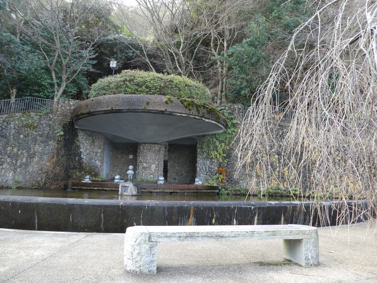 有馬温泉駅から温泉街の方に歩いて太閤橋の交差点の突き当たりの、太閤秀吉の坐像の脇の池のある小さな公園。裏から池の後ろ側に降りることができて、そこには小便小僧?カッパ?たぬき?の像が。