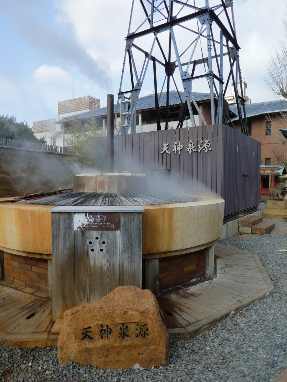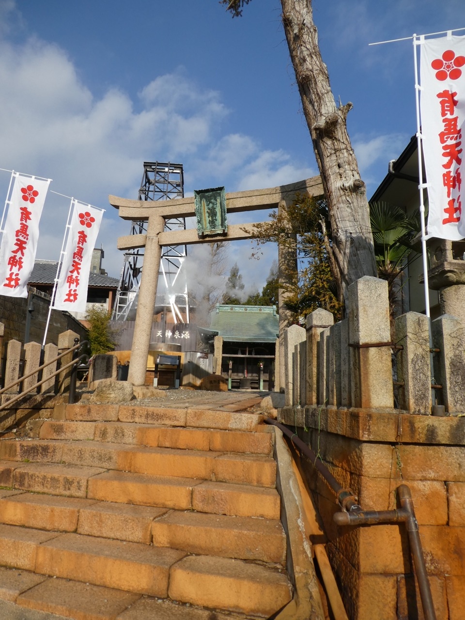 有馬温泉の歴史コースの湯本道からちょっと外れたところにあります。神社の境内に大きな温泉塔とその前に円盤状の直径3mほどのコンクリの塊があり、もうもうと蒸気があがっていて温泉の豊富な湯量を感じます。