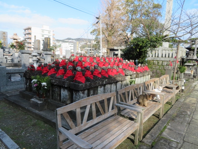 長い階段を上がった先に本堂があります。階段の下に五百羅漢とは言いすぎですが、階段の下にたくさんのお地蔵さんがいます。このお地蔵さんの前に椅子があって、たくさんの猫が日なたぼっこをしていました。名前の通り仏の道を行く延命寺です。