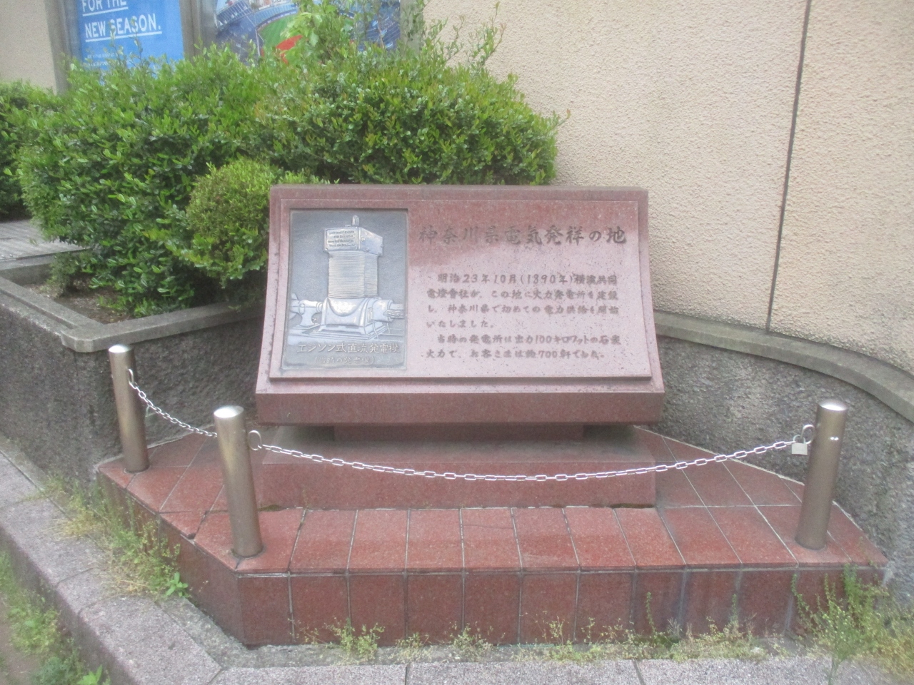 5月上旬頃にお一人でこの神奈川県電気発祥の地に訪問しました。横浜共同電灯会社が石炭火力発電所を建設した地で、当時、市内の700軒ほどに電力の供給を開始されたところです。前に来たときに気づきませんでしたが、碑に描かれているのは当時の直流発電機でした。