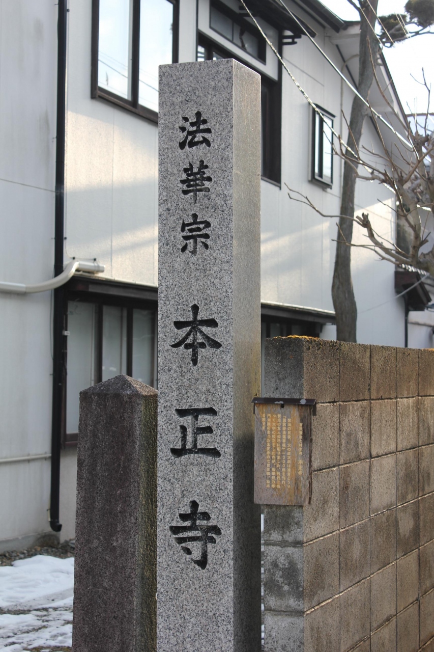 本正寺の名が刻まれた石柱の横に説明板があり、「宮沢賢治の死後に賢治の父が「国訳妙法蓮華経」の発行にあたり、本正寺の住職が校正をした」そうで、少し薄い気がしますが宮沢賢治と関係があるお寺です。