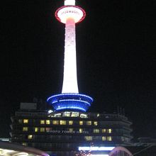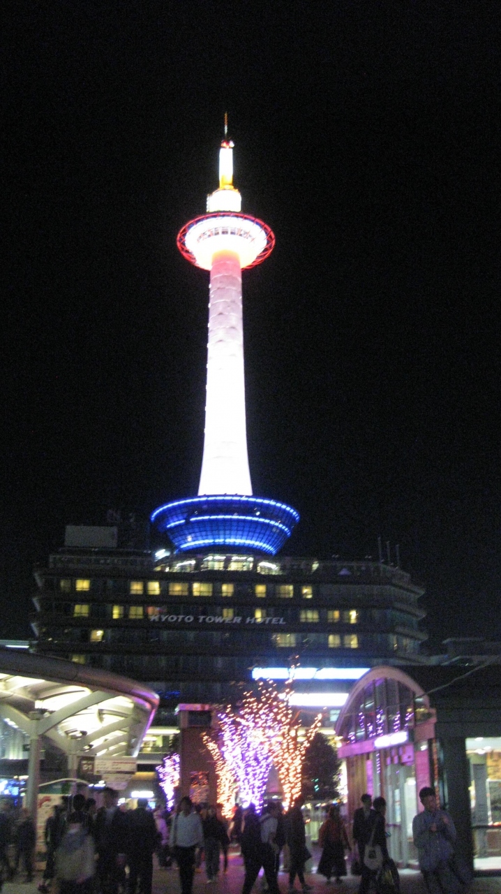 昼間の京都タワーは何だか京都の町に似合わない感じ(個人感想)ですが、夜はライトアップされていて、周りに高い建物がないのでニョッキと建っている姿はとても目立ち綺麗でした。