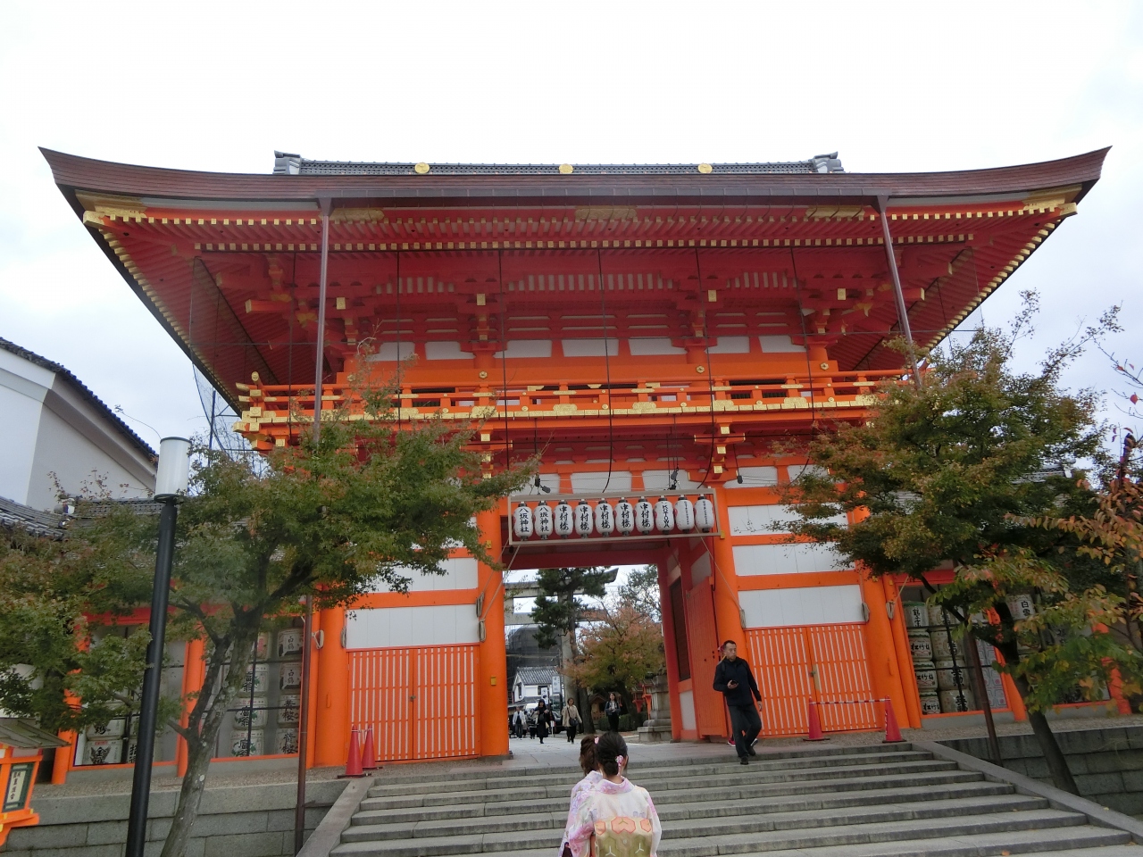 八坂神社南側の石鳥居をくぐった先にある2階建ての朱色の門でここが正門になります。